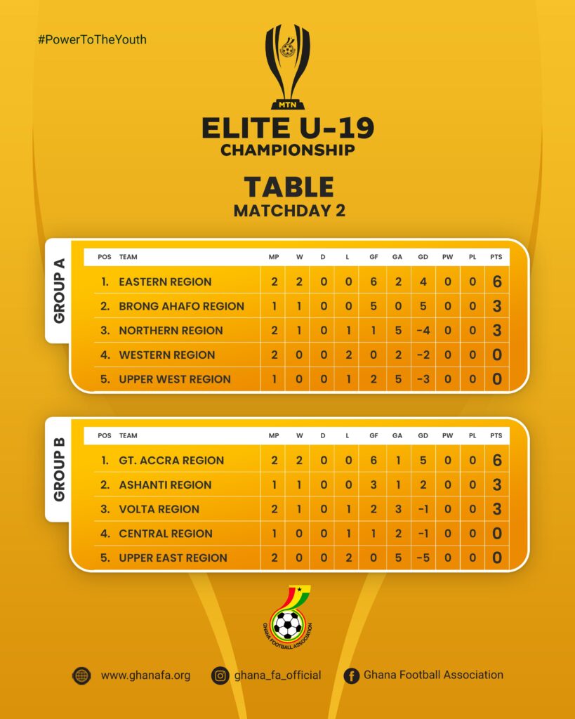 Eastern Region and Greater Accra Region have taken firm control of their respective groups following the conclusion of Matchday Two in the ongoing MTN Elite U19 Championship on Saturday, October 25, 2025, at the Ghanaman Soccer Centre of Excellence in Prampram.
