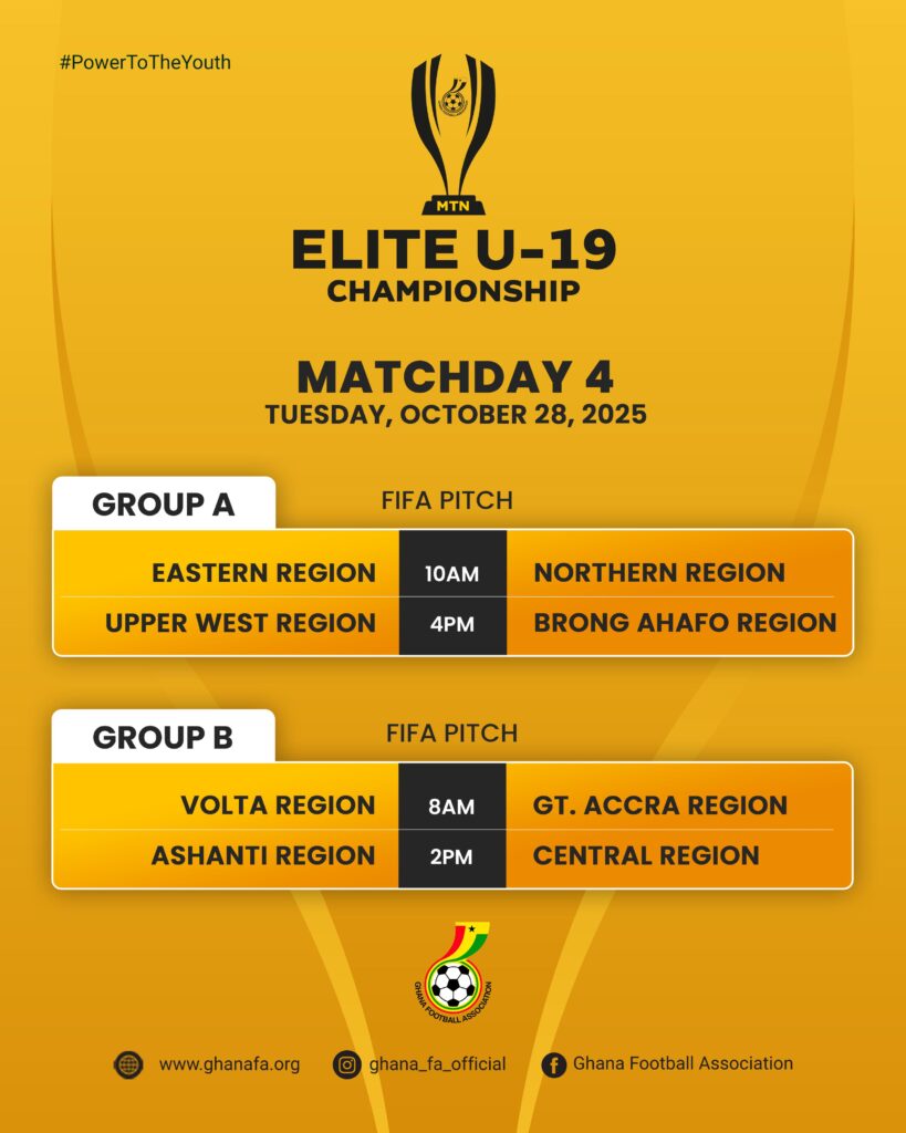 The MTN Elite U19 Championship enters matchday four on Tuesday, October 28, 2025, with four exciting fixtures lined up at the Ghanaman Soccer Centre of Excellence.