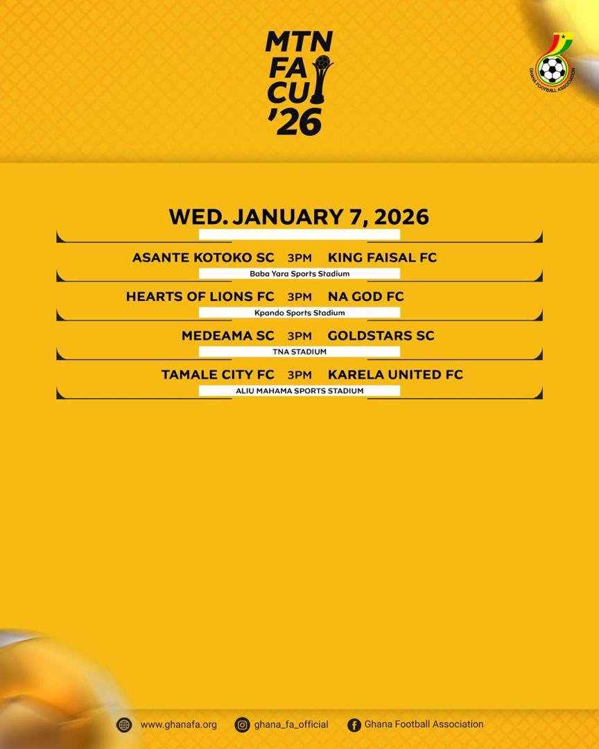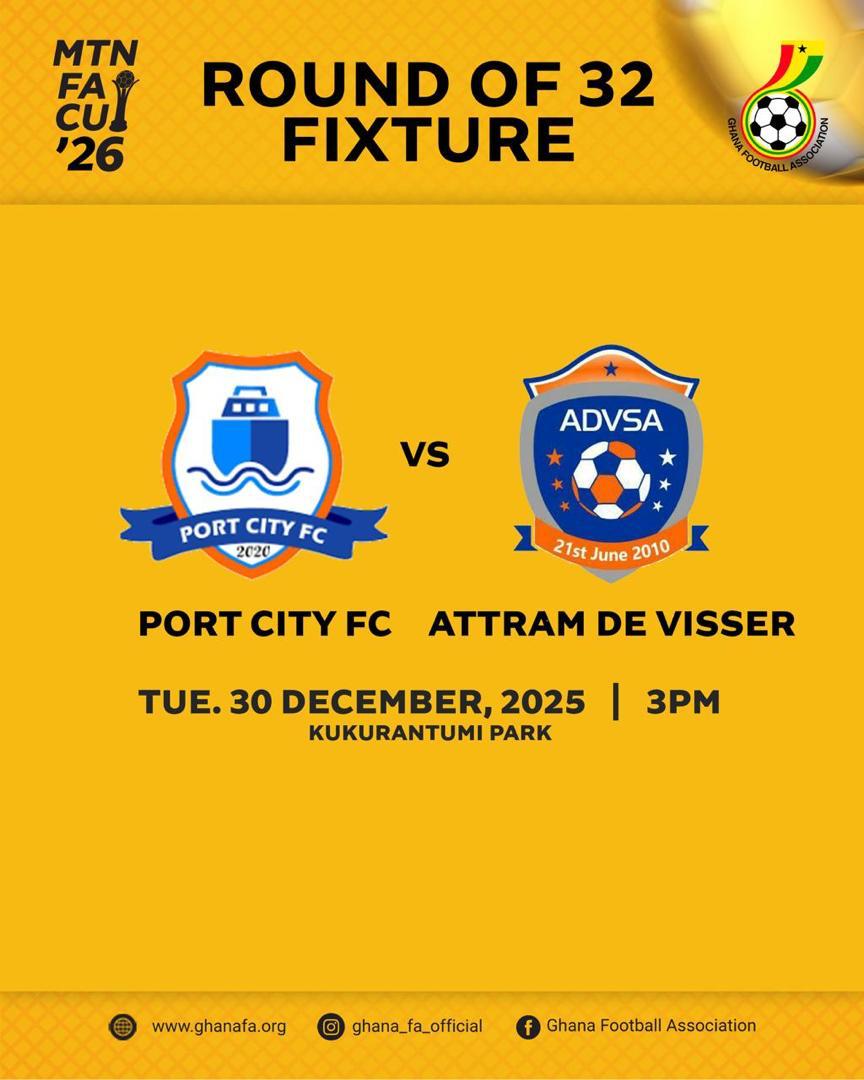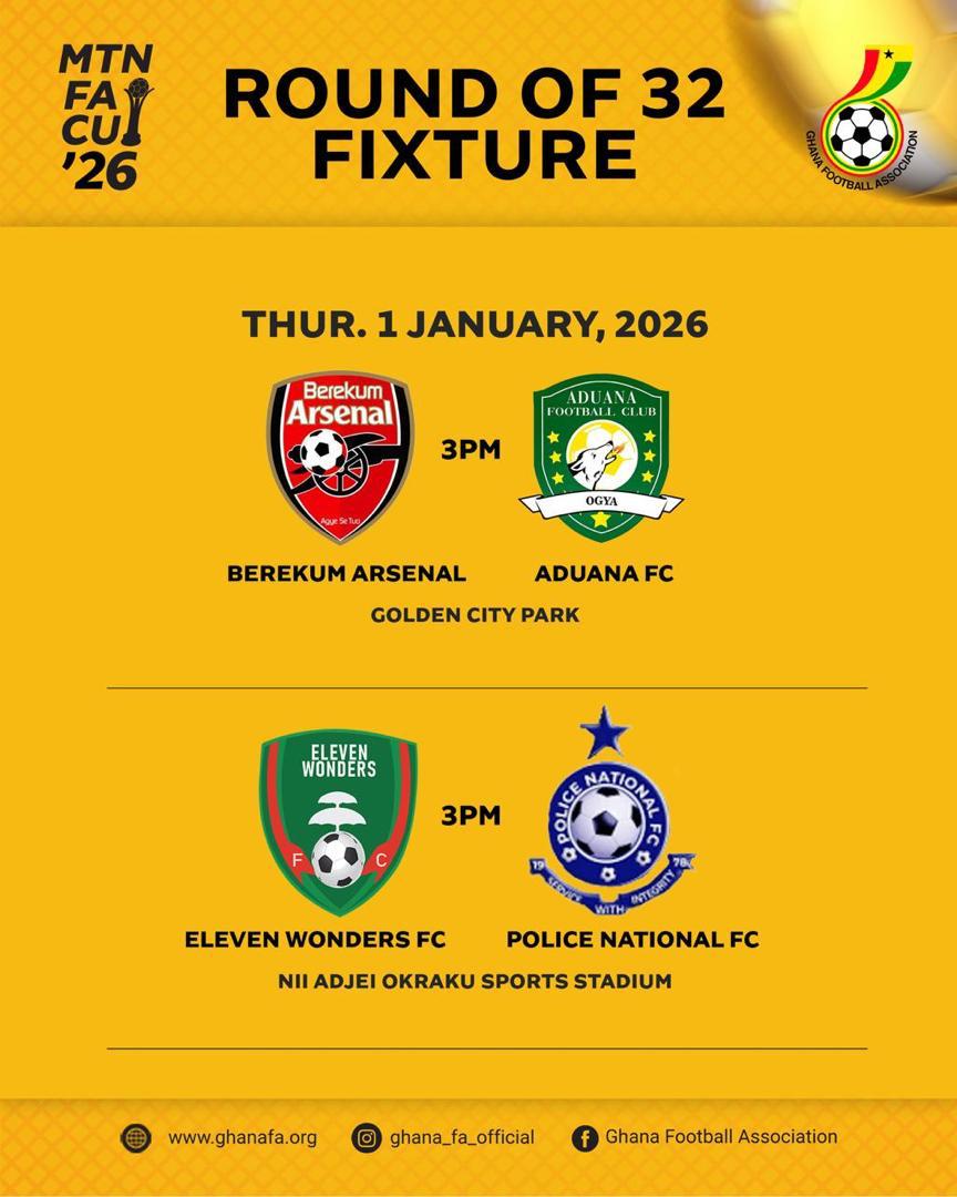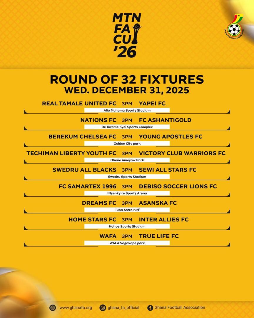 Other Round of 32 fixtures kick off on Wednesday, December 31, 2025, with Swedru All Blacks taking on Sefwi All Stars at the Swedru Park, and FC Samartex 1996 facing Debiso Soccer Lions FC.