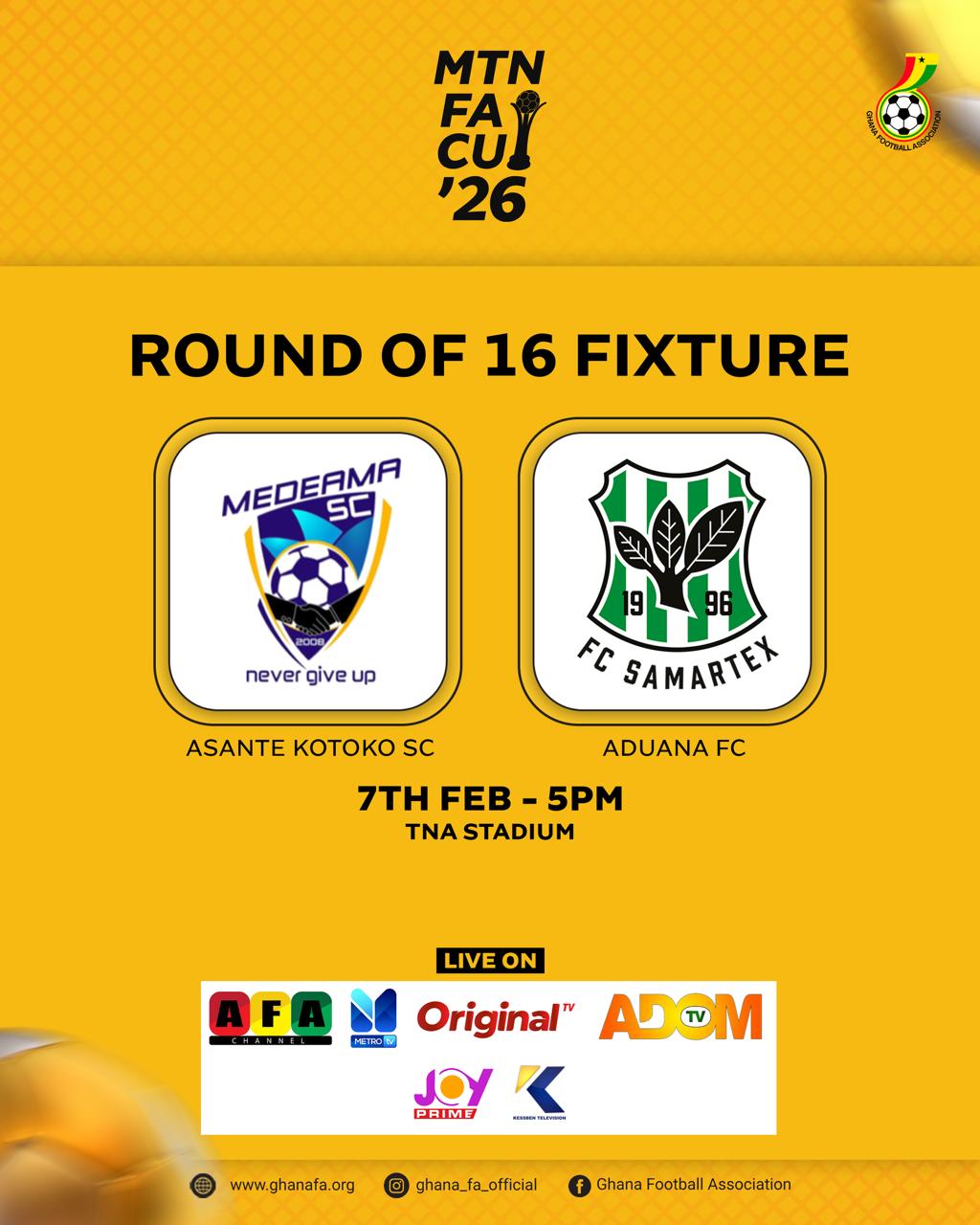 Broadcast partners AFA, Metro TV, Original TV, Adom TV, and Joy Prime will air the Medeama SC vs FC Samartex 1996 game on Saturday, February 7, at the T&A Park. Later on Sunday, February 8, the game between champions Asante Kotoko and Aduana FC will be broadcast live from the Baba Yara Sports Stadium.