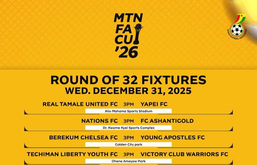 Berekum Chelsea will host Young Apostles in the MTN FA Cup Round of 32 at the Golden City Park on Wednesday, December 31, 2025. The two Premier League sides come face-to-face against each other on New Year's Eve, having fought their way through to this stage of the competition. The Blues qualified for this stage after beating Zone One B leaders Debibi United 2-1, while Young Apostles went past Dormaa Unity in the Round of 64.