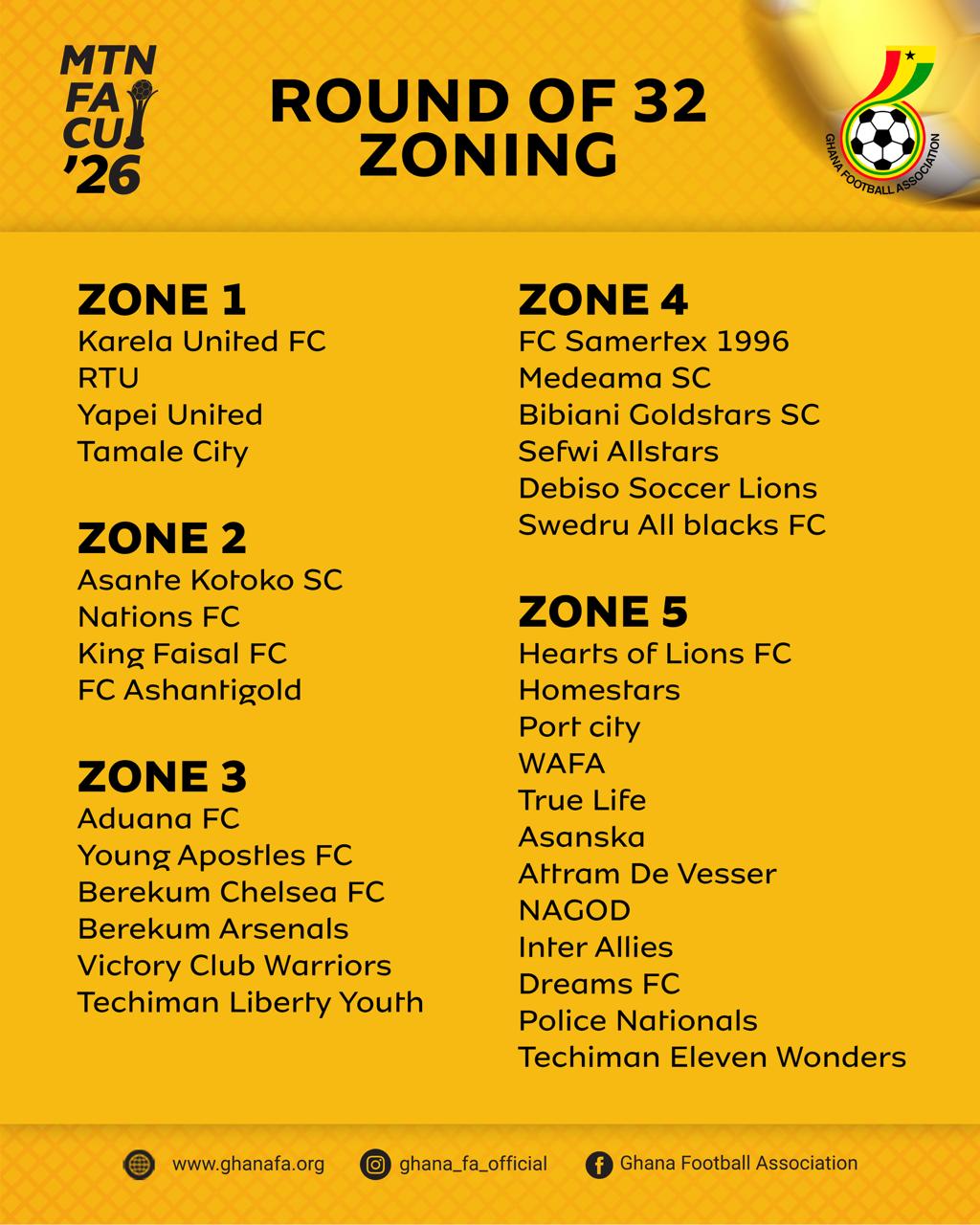 The draw for the Round of 32 of the MTN FA Cup will take place on Tuesday, December 16, 2025. Thirteen Premier League clubs, 16 Division One League clubs, and three Second Division teams will learn their opponents. Record holders Accra Hearts of Oak have been eliminated from the tournament following a 1-0 loss to True Life FC in the previous round.