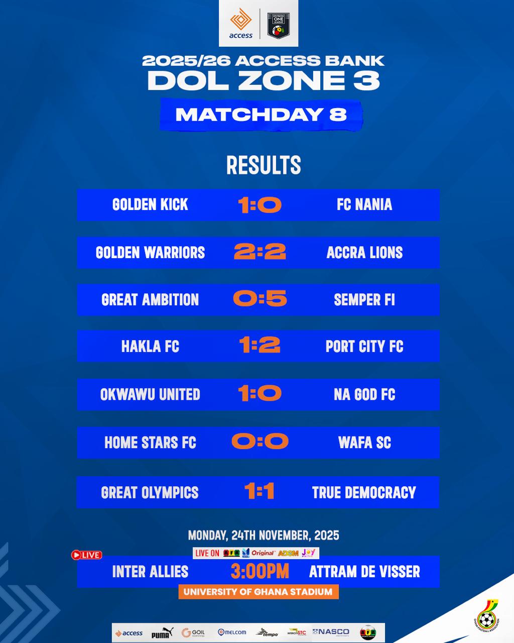 Also, Golden Kick SC snapped their two-game winless run (D1, L1) with a hard-fought 1-0 victory over FC Nania at the Tuba AstroTurf on Saturday, securing their fifth win of the season — the joint-highest in the Zone. Defensive midfielder Adomba Kofi Aninagyei broke the deadlock just two minutes into the second half after a dull, goalless first half. Golden Kick SC have now amassed 16 points from eight matches in the League.