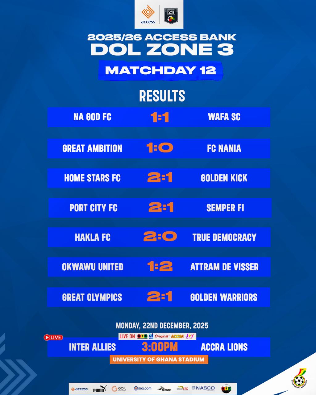 Former Premier League side Great Olympics recorded a third consecutive league victory after edging newly promoted Golden Warriors 2–1 in an entertaining clash at the McDan Sports Complex in Teshie on Sunday. The hosts opened the scoring in the 19th minute after an own goal by Abdul Basit, before Justice Nti doubled their advantage before halftime. Golden Warriors responded after the break, with Leonard Abrokwa pulling one back in the 50th minute to set up a tense finish. Great Olympics held firm to secure all three points, leaving them in mid-table with 16 points from 12 matches.