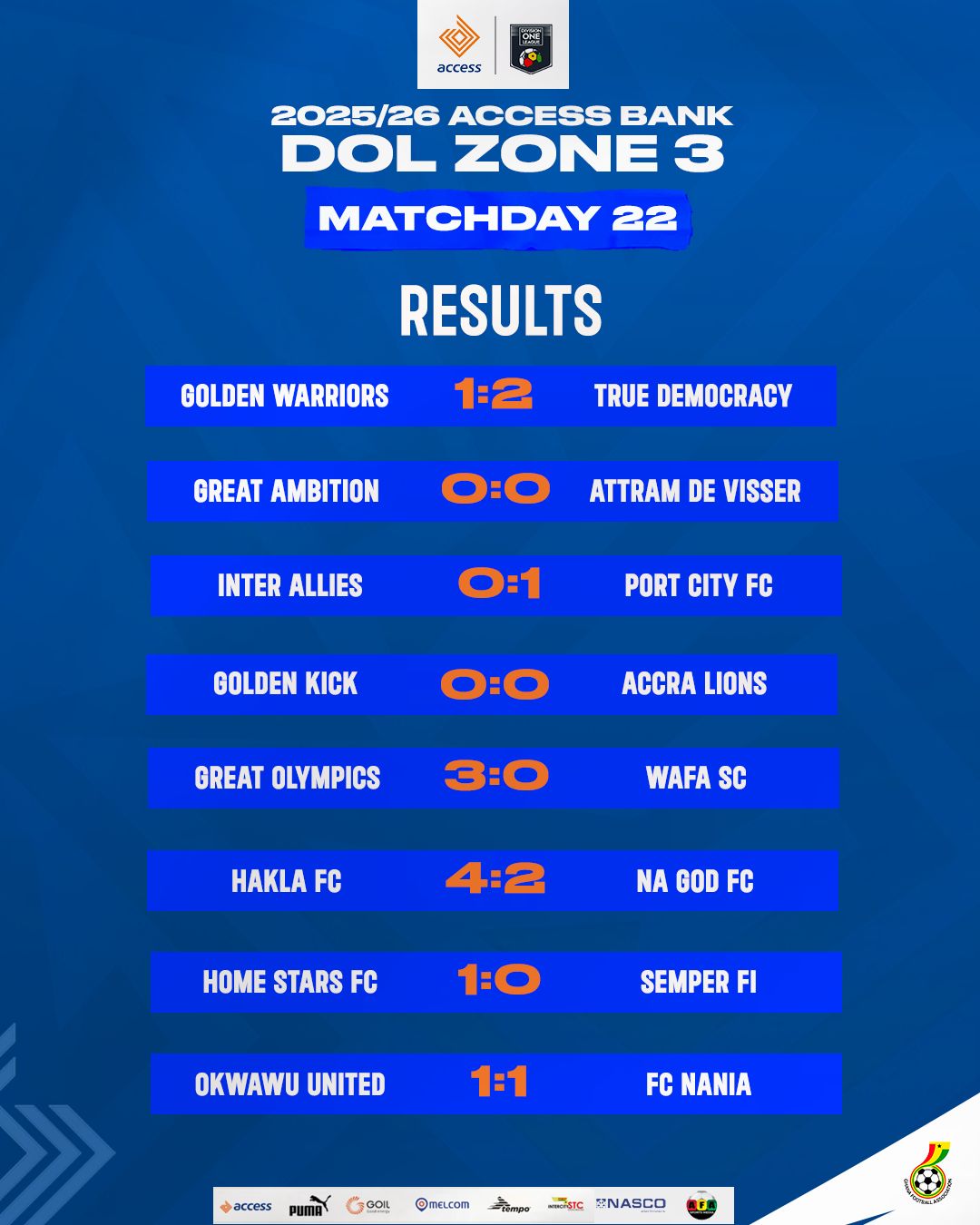 Elsewhere, Accra Great Olympics moved out of the relegation zone after ending their three-game winless run (one draw, two losses) with an emphatic 3-0 victory over WAFA SC at the McDan Sports Complex in Teshie on Sunday. Frederick Akatuk opened the scoring from the penalty spot in the 12th minute before adding his second goal in the 35th minute to give Olympics a comfortable two-goal lead at halftime. David Sewornu later sealed the victory with a brilliant finish in the 54th minute. Great Olympics now have 25 points from 22 matches.