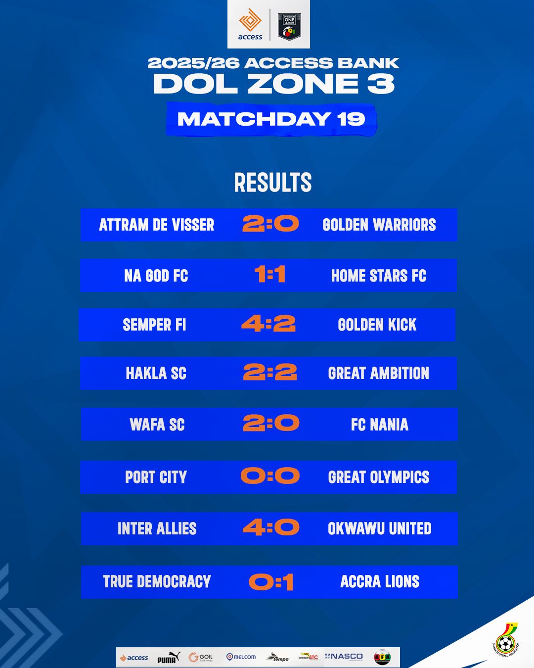 Meanwhile, Attram De Visser bounced back from consecutive 1-0 defeats with an impressive 2-0 home win over newly-promoted Golden Warriors at the Tuba Astroturf. Alfred Amoah opened the scoring in the 25th minute with a powerful strike from outside the box, before Abdul Majeed Maswud added the second goal six minutes later. Attram De Visser currently sit fourth in the Zone with 31 points.