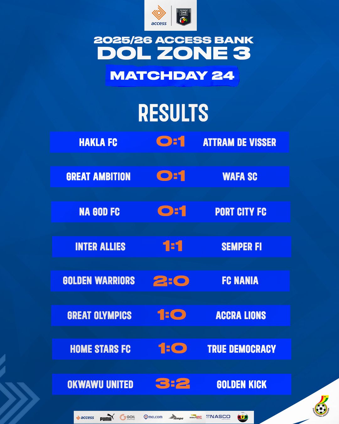 Matchweek 24 action in Zone Three of the Access Bank Division One League saw table-toppers Port City FC further solidify their grip on the summit, while their closest rivals, Semper Fi FC, dropped crucial points. Meanwhile, former Premier League side Great Olympics continued their impressive resurgence.