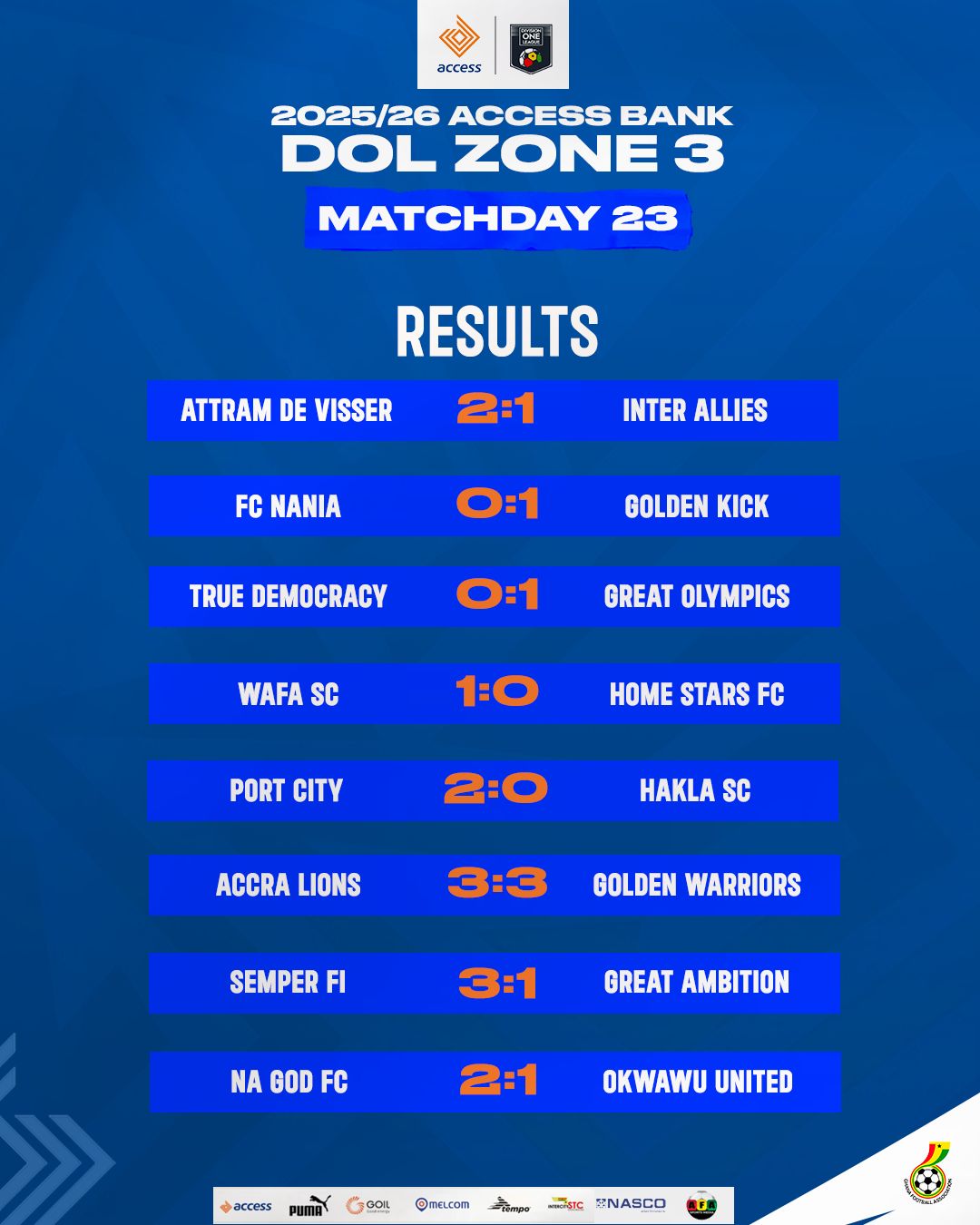 Second-placed Semper Fi FC responded strongly to their recent away defeat with an impressive 3-1 win over newly promoted Great Ambition at the McDan Sports Complex in Teshie. Samuel Adonteng and Ebenezer Kobia found the net in the first half to hand the hosts a comfortable lead at the break. Kobia completed his brace five minutes after the restart, before Abdul Rashid Laryea grabbed a late consolation for the visitors in the 90th minute.