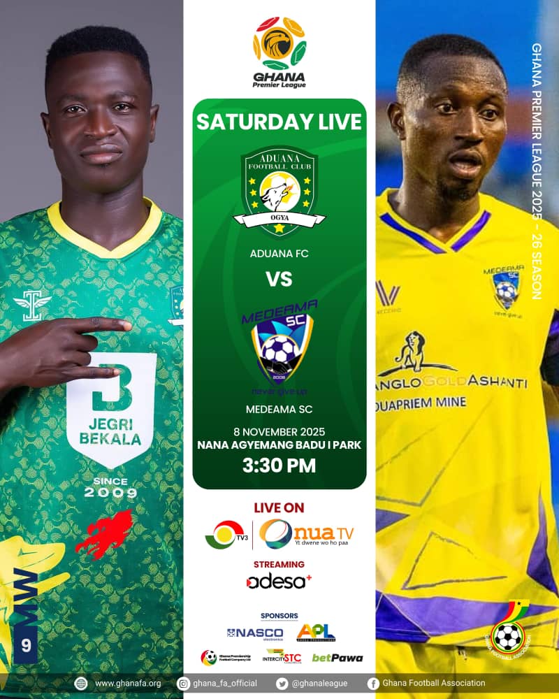 All eyes will be on the Nana Agyemang Badu I Park on Saturday, November 8, 2025, as Aduana FC host Medeama SC in a highly anticipated Premier League top-of-the-table clash.