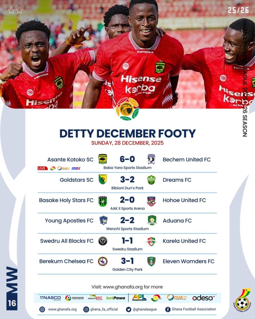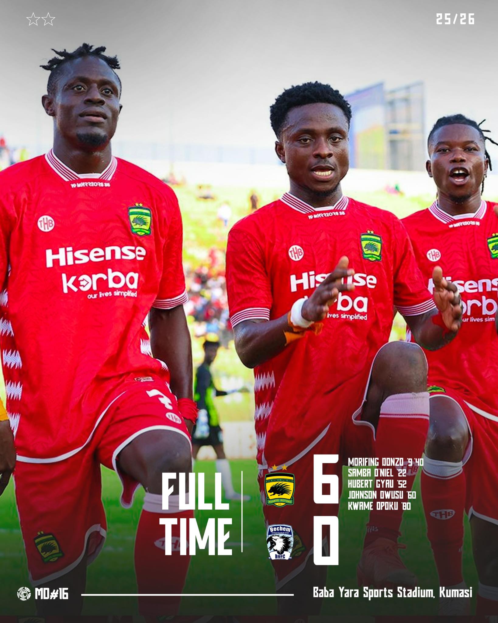 Asante Kotoko closed the year in emphatic fashion, delivering a ruthless 6–0 demolition of Bechem United at the Baba Yara Sports Stadium to surge to the top of the Premier League table. It was Kotoko’s biggest win in several seasons and a clear statement of intent under Karim Zito.