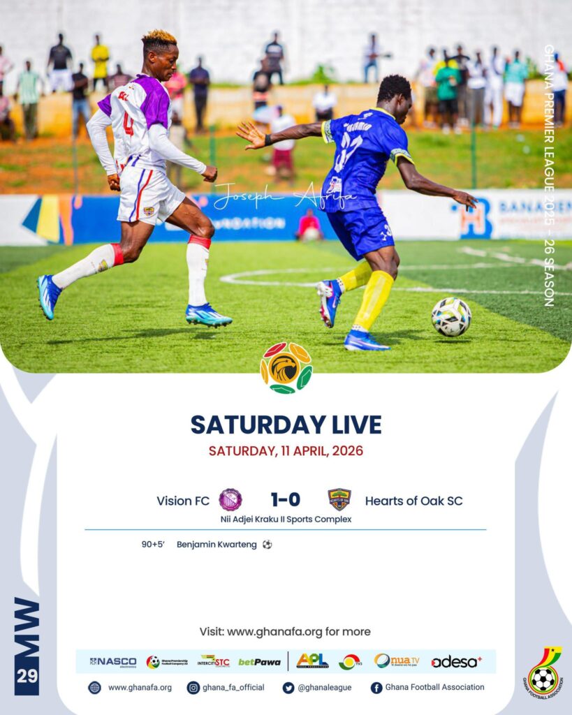 A dramatic late strike from Benjamin Kwarteng secured a thrilling 1-0 victory for Vision FC over Hearts of Oak in the Premier League on Saturday afternoon in Tema. Just as the contest seemed destined to end in a goalless draw, Kwarteng rose to the occasion in the 90+5th minute, delivering a decisive blow that sent the home fans at the Nii Adjei Kraku II Sports Complex into rapturous celebration. The match itself was a tightly contested affair, with both sides evenly matched in possession but lacking cutting edge in the final third for much of the game. Vision looked the more threatening of the two, registering the clearer attempts on goal, while Hearts of Oak struggled to find rhythm and precision in attack. The victory extends Vision’s unbeaten home run to five matches, reinforcing their steady climb away from the relegation zone and solidifying their mid-table standing. For Hearts of Oak, the defeat is a setback in their title pursuit. They remain third on the table with 46 points, now five behind league leaders Gold Stars, as the race for the शीर्ष spot intensifies.