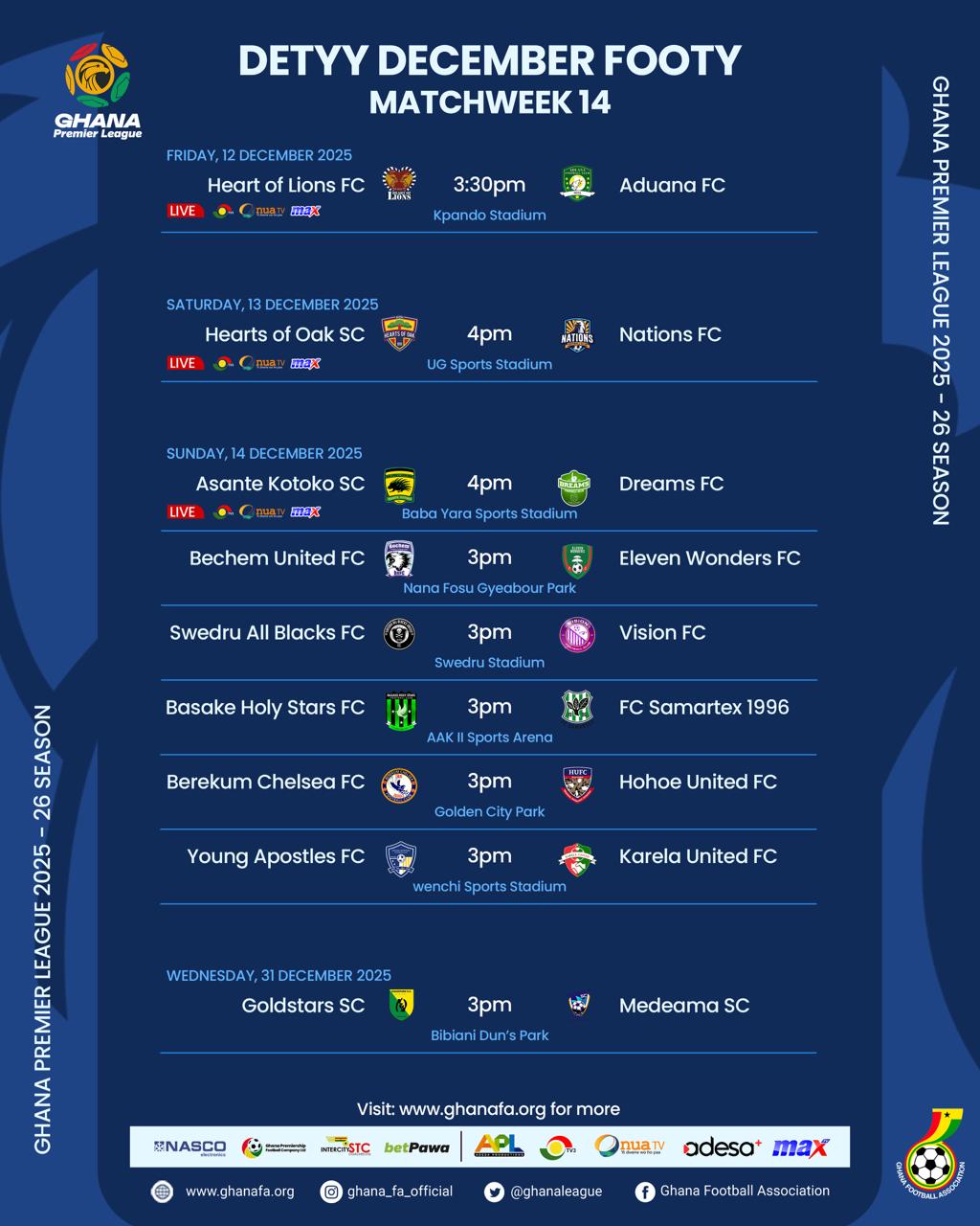 Additionally, Medeama’s Matchday 15 Western Derby at home against Basake Holy Stars has been moved from Friday, December 19, to Monday, December 22, 2025.