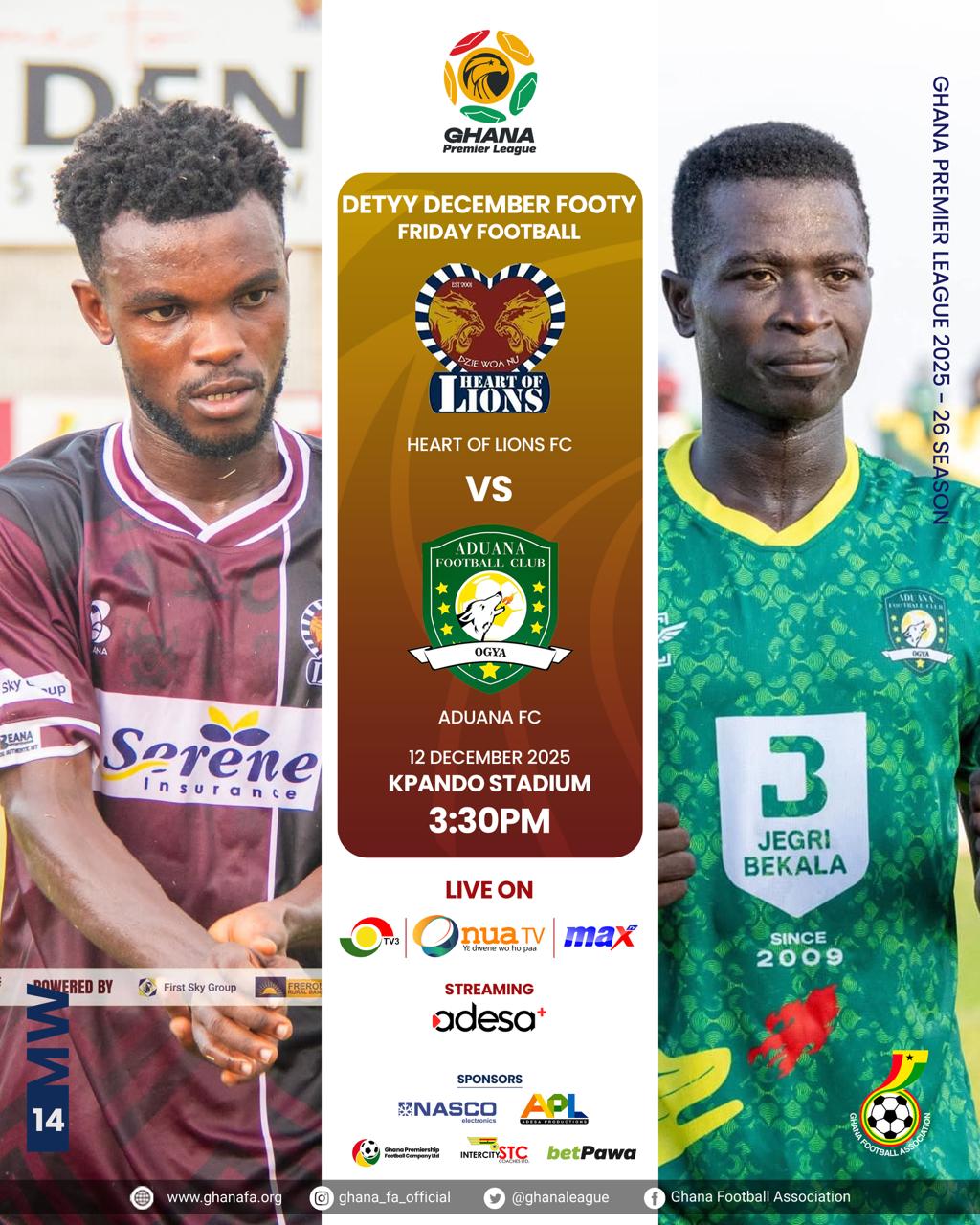 Two of the Premier League’s top three sides open the weekend’s fixtures with blockbuster, as second-placed Aduana FC travel to the Kpando Sports Stadium to face Heart of Lions on Friday, December 12, 2025.