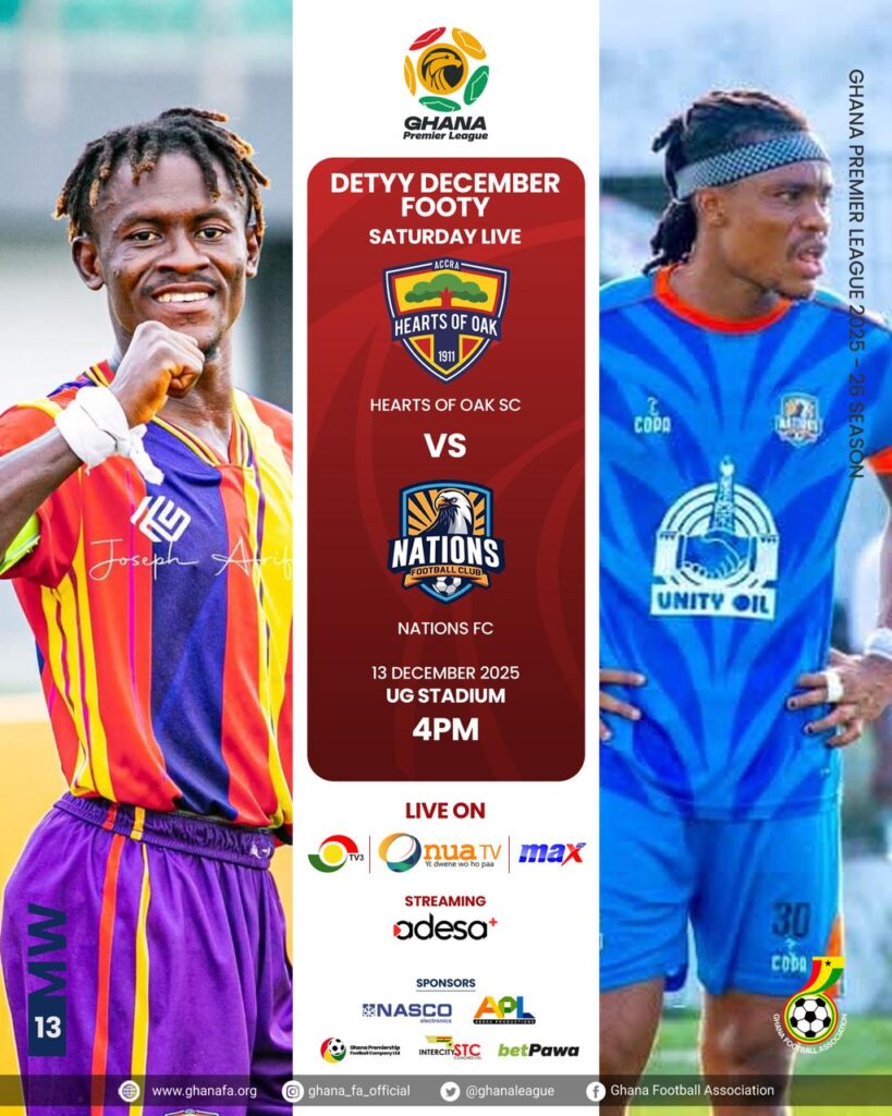 Hearts of Oak will be eager to halt their troubling dip in form when they host Nations FC at the University of Ghana Sports Stadium on Saturday, December 13, 2025, in a crucial Premier League encounter.