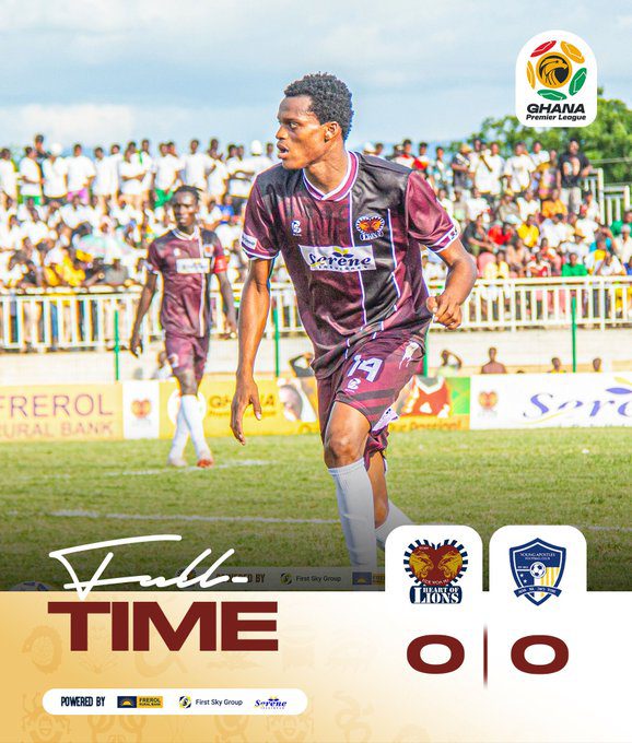 Despite dropping their first home points of the season at the Kpando Sports Stadium, Heart of Lions remain second on 23 points—same as Medeama SC, who drew away a two-goal lead to draw 2-2 at Asante Kotoko.