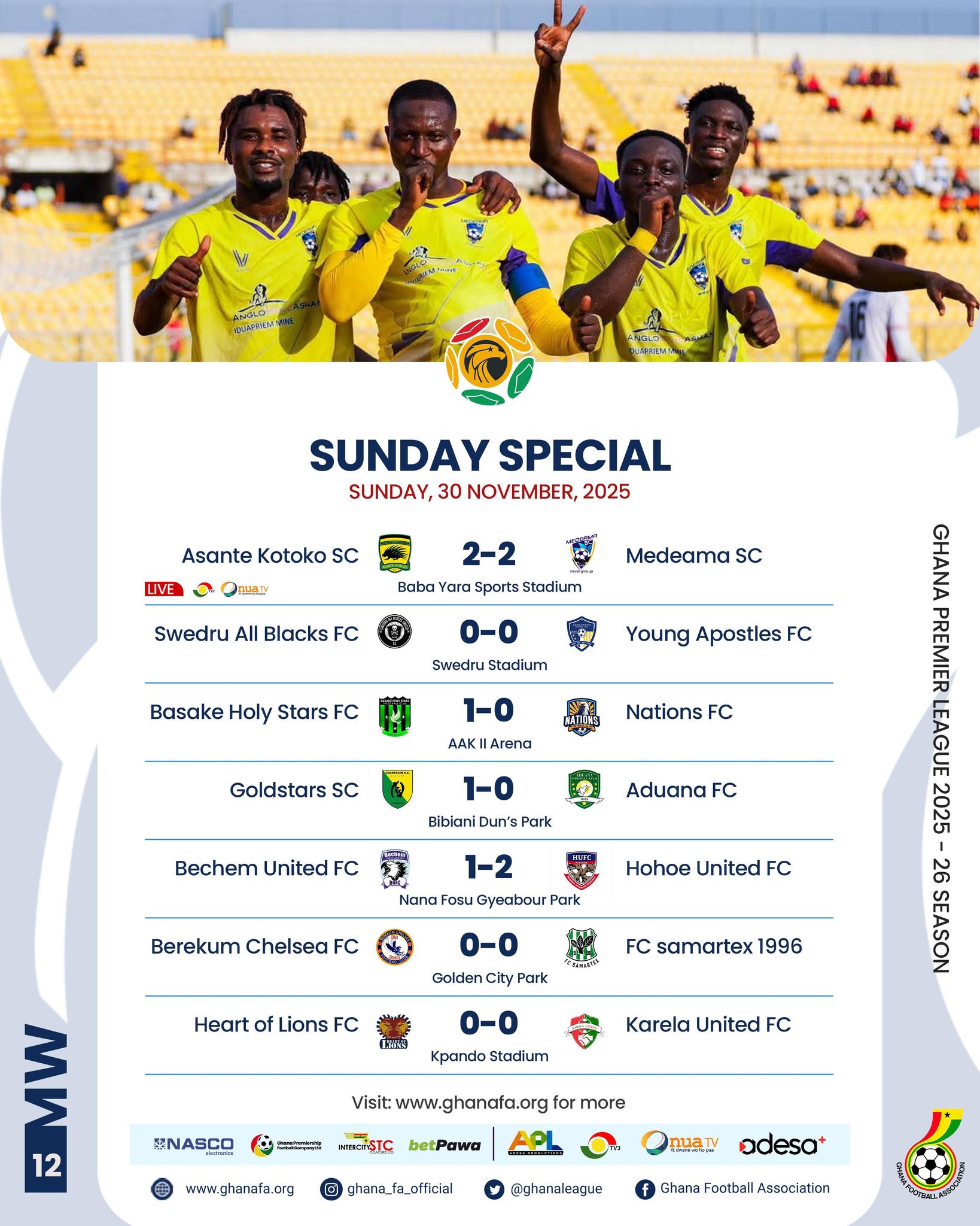Asante Kotoko produced a spirited fightback to hold Medeama to an entertaining 2–2 draw in Kumasi, recovering from two goals down to claim a hard-earned point on home soil. Elsewhere, Hohoe United delivered the standout performance of the weekend, securing a famous 2–1 away victory over Bechem United, their first away win in the Premier League while Champions Bibiani Gold Stars also made a statement, defeating Aduana FC at Dun’s Park to climb into the top four as their title defence gathers momentum.