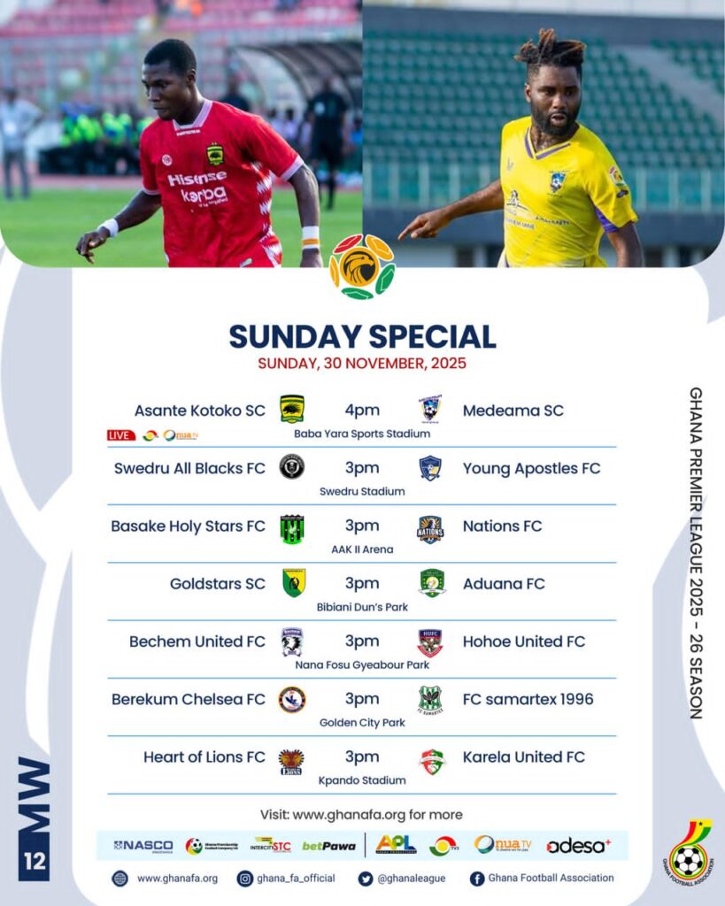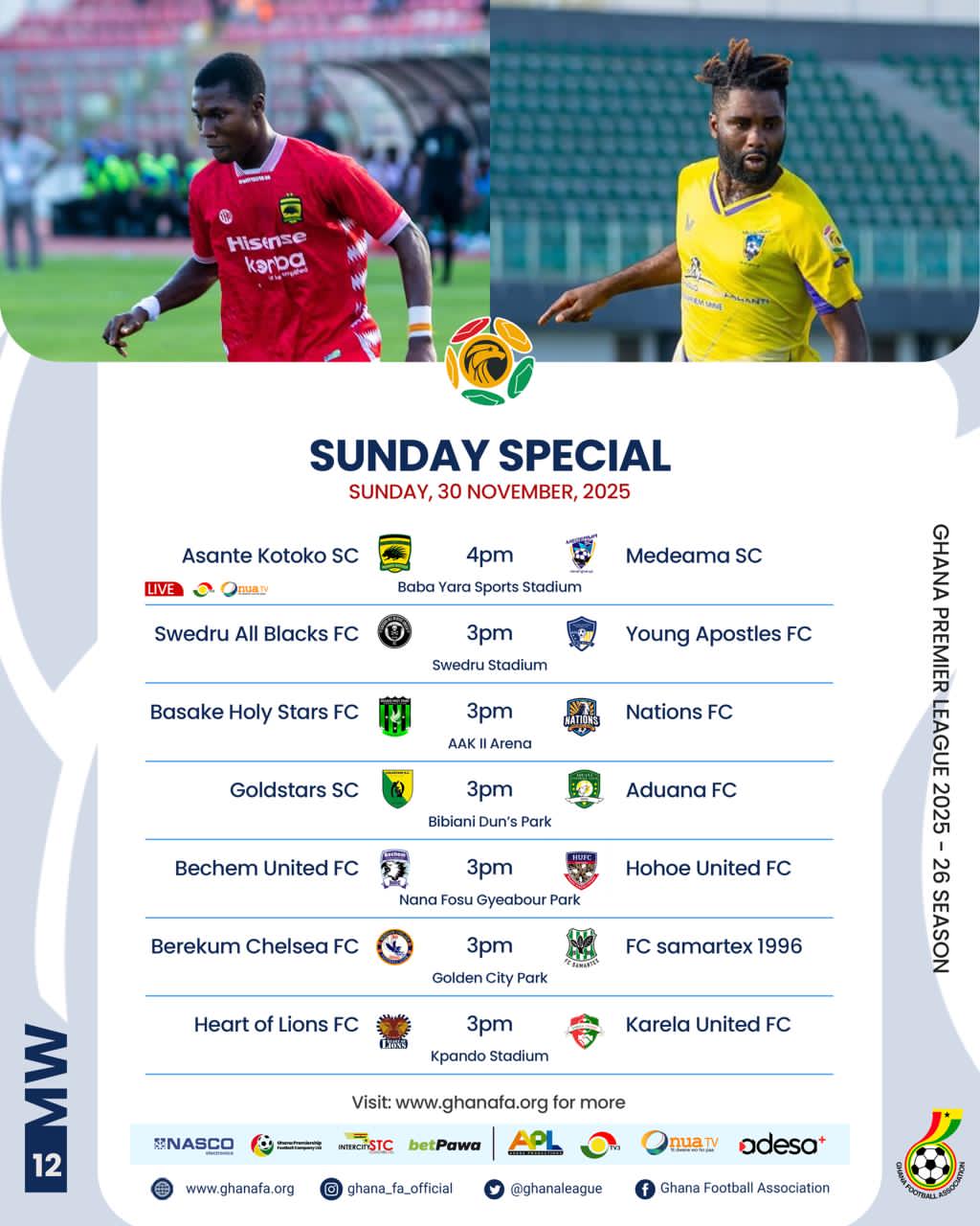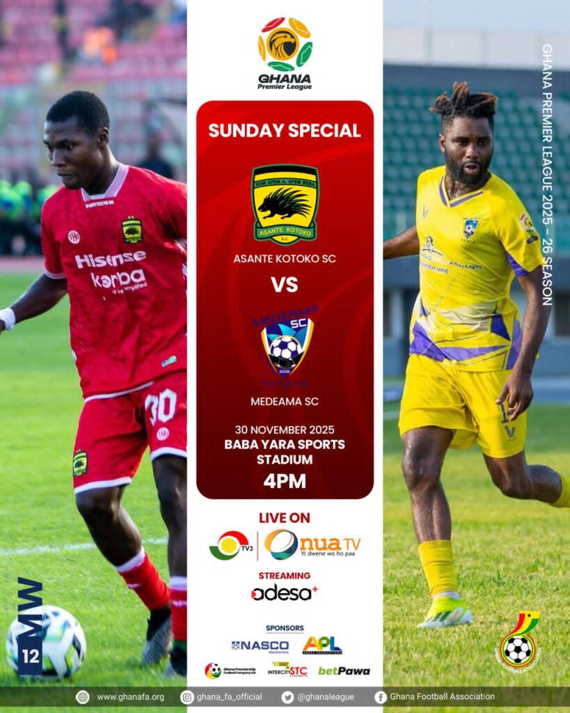 Asante Kotoko welcome Medeama SC to the Baba Yara Stadium in the headline fixture of Premier League matchday 12, while leaders Aduana FC travel to defending champions Bibiani Gold Stars in a high-stakes showdown. At the Golden City Park, Berekum Chelsea aim to steady their campaign as they host FC Samartex.