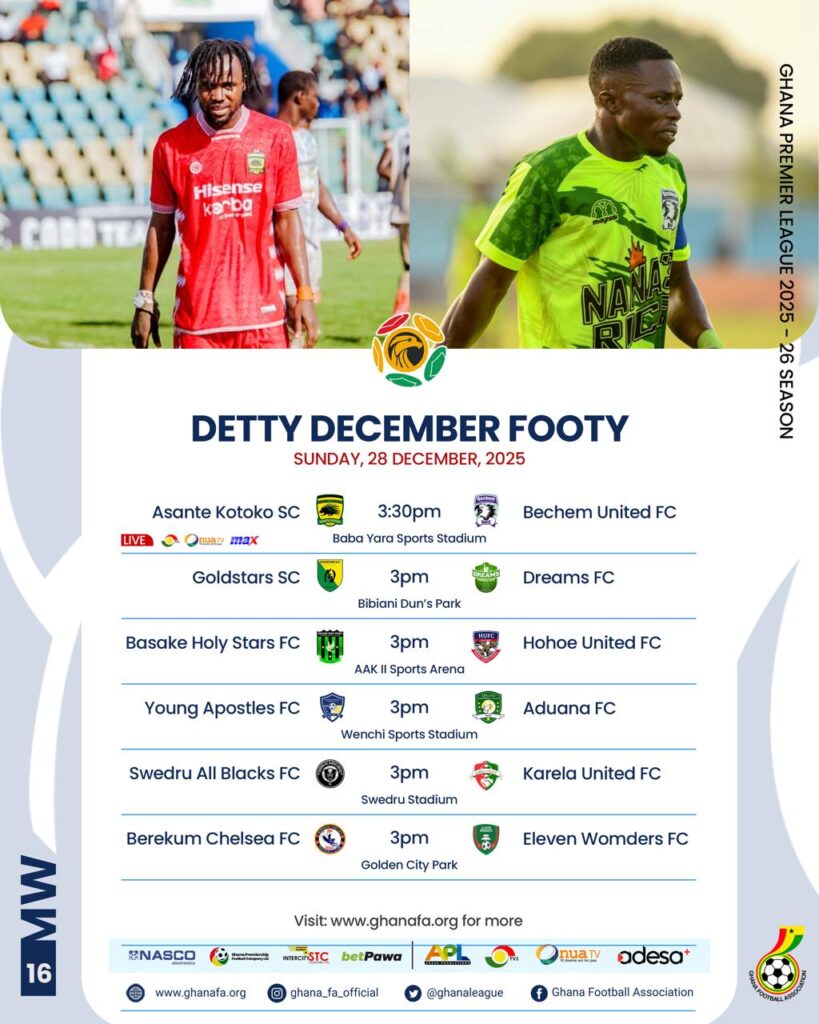 League leaders Aduana FC face a tricky trip to Wenchi to take on Young Apostles, who have turned their home ground into a fortress in recent weeks. Aduana boast the league’s second-best defence and have lost just once in eight matches.