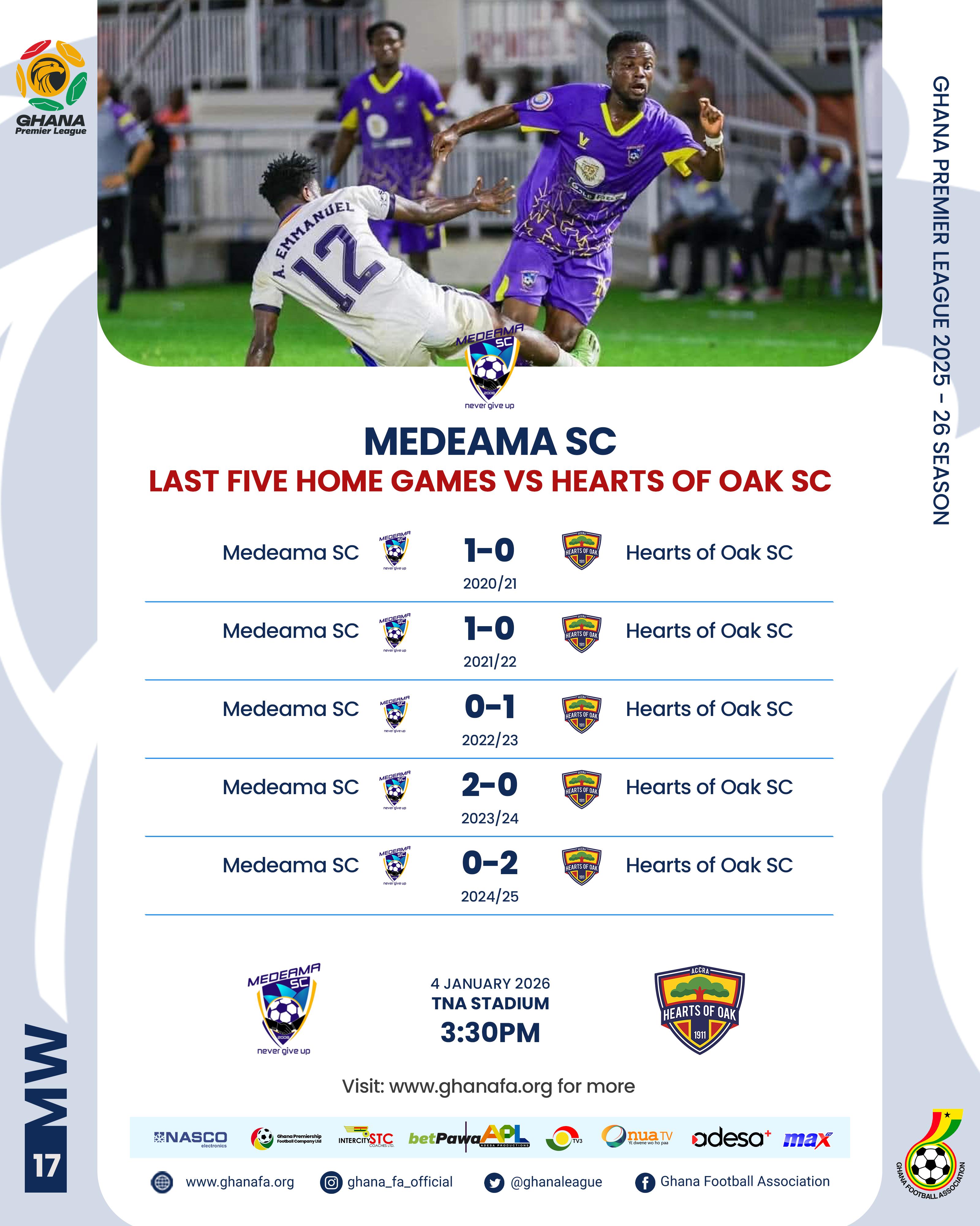 League leaders Medeama SC will look to consolidate their position at the summit when they host former champions Hearts of Oak at the Tarkwa and Aboso Stadium. Ibrahim Tanko’s side remain unbeaten in 13 league matches and boast one of the league’s most balanced attacks and defenses. Hearts of Oak, meanwhile, travel to Tarkwa in solid form, built on the best defensive record in the Premier League and strong away performances. With both sides among the title contenders, this clash promises to be a heavyweight encounter.