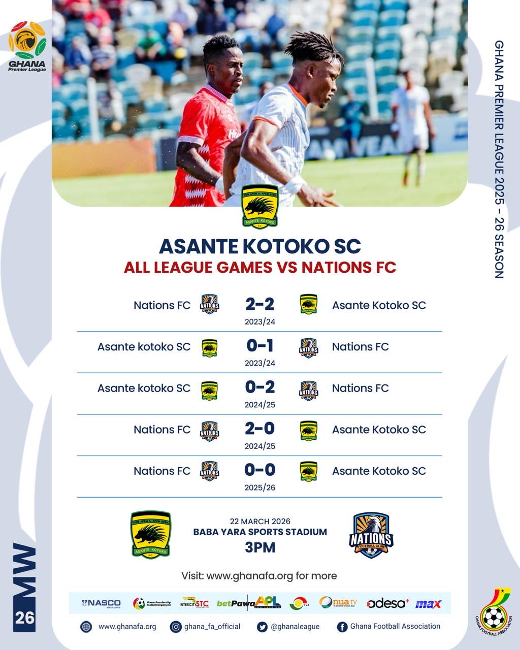 Despite their recent inconsistency, the Porcupine Warriors remain one of the league’s strongest home sides, while Nations FC make the short journey full of confidence after back-to-back wins and FA Cup progress, having already beaten Kotoko twice in previous meetings.