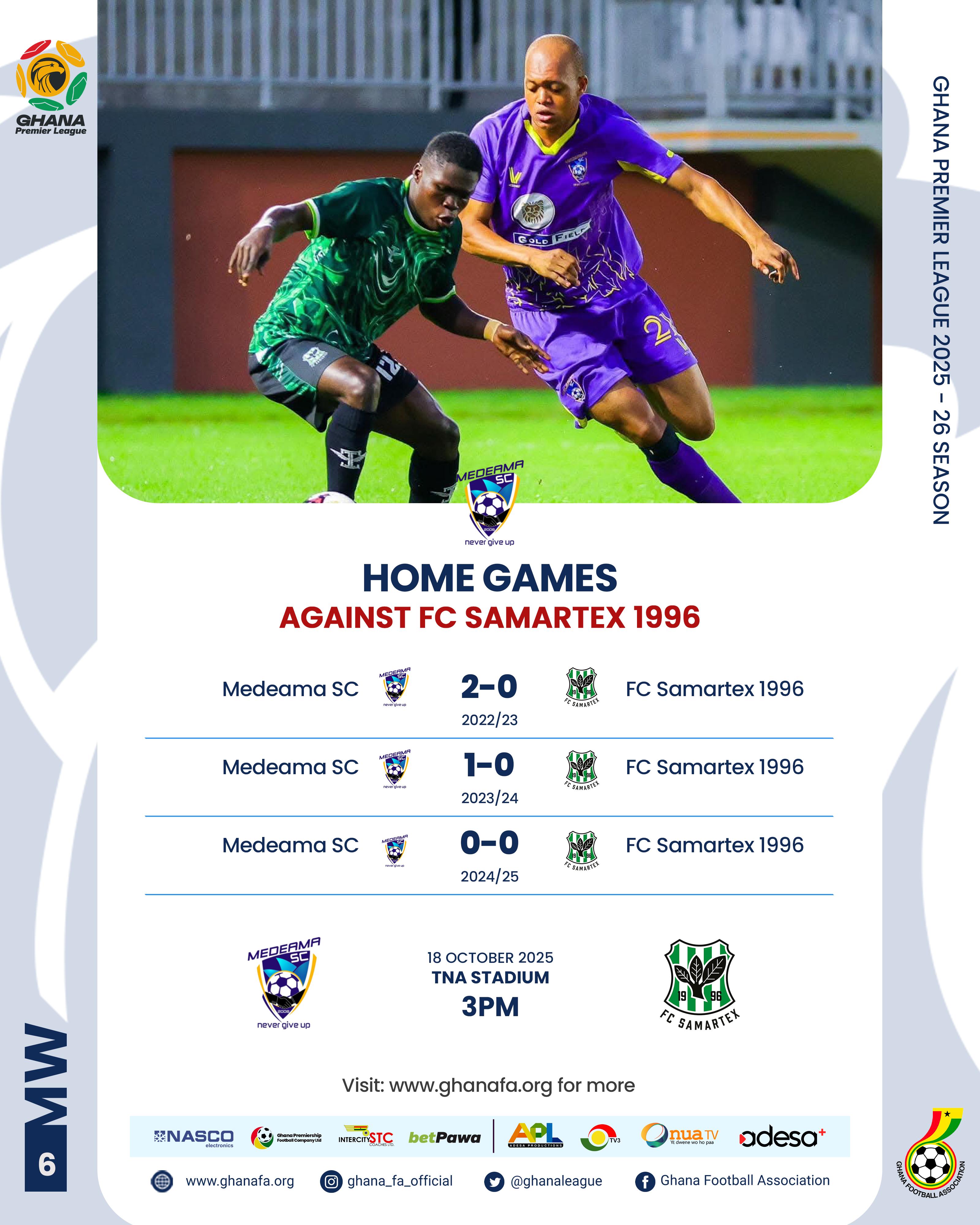 League leaders Medeama SC will look to maintain their fine form and unbeaten home record when they host an in-form FC Samartex 1996 at the Tarkwa and Aboso Stadium on Saturday, October 18, 2025.