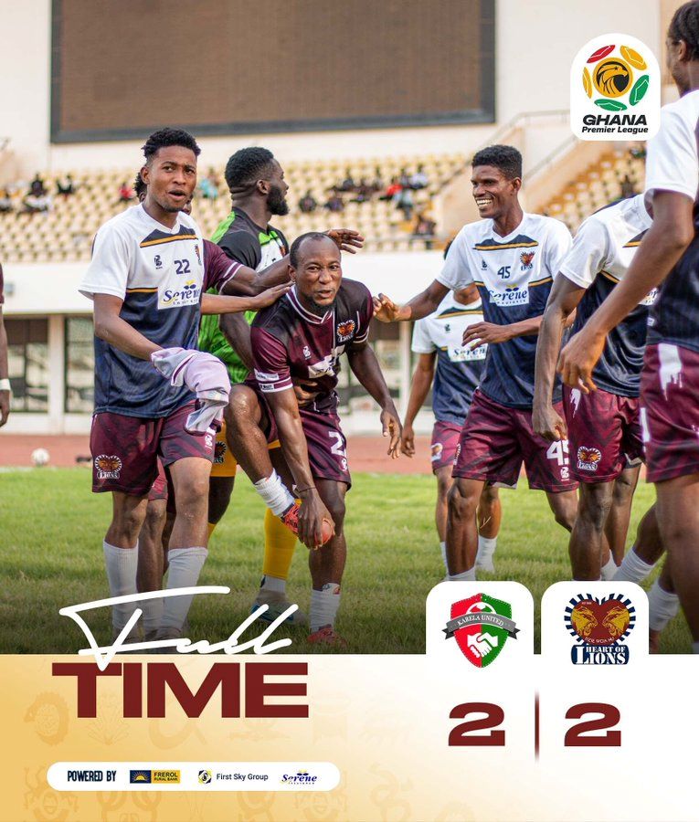 Karela United were held to an entertaining 2–2 draw by ten-man Heart of Lions in their Matchday 29 clash at the Aliu Mahama Sports Stadium.