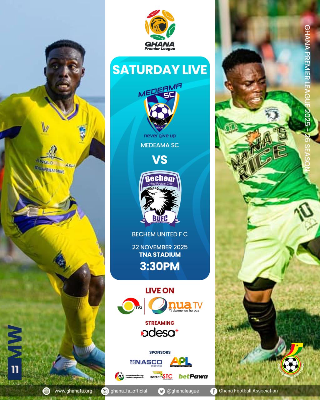 League leaders Medeama SC will look to extend their impressive at home run when they host Bechem United at the Tarkwa and Aboso Stadium on Saturday, November 22, 2025.