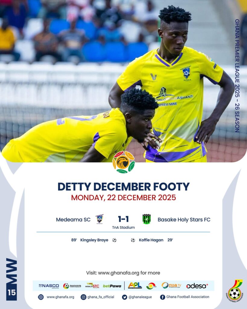 Medeama SC were left frustrated at home after settling for a 1–1 draw against Basake Holy Stars on Monday, missing a golden opportunity to reclaim top spot in the Premier League. The visitors stunned the former champions in the 29th minute when Koffie Hagan capitalised on a costly goalkeeping error from Abdul Adams Jabal, calmly slotting home from close range to give Holy Stars a surprise lead at the TnA Stadium. Despite dominating possession and pushing forward for much of the contest, Medeama struggled to break down a disciplined Holy Stars defence and looked set for a damaging home defeat. Relief finally arrived in the 89th minute when substitute Kingsley Braye rose to the occasion, firing in the equaliser to restore parity and ignite hopes of a late winner. However, Holy Stars held their composure in the closing moments, standing firm to secure a valuable point on the road and deny Medeama a return to the summit. The result leaves Medeama in second place on 27 points, one behind league leaders Aduana FC. The Tarkwa-based side will rue the missed opportunity, particularly on home soil, but still have a chance to mount another title push with an outstanding fixture against Gold Stars set for December 31.
