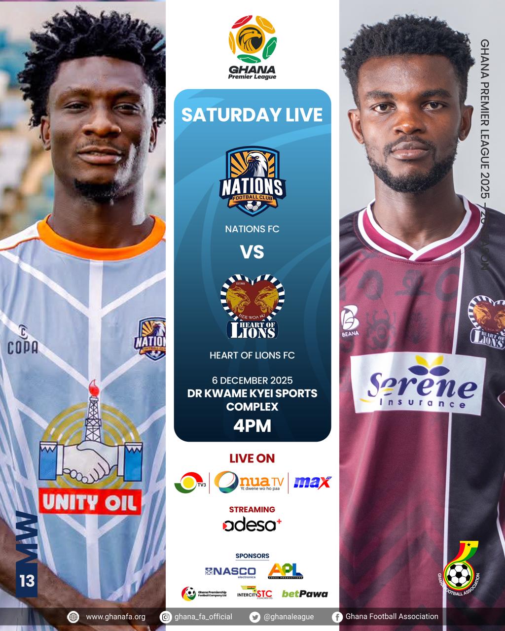 Nations FC will be looking to bounce back to winning ways when they welcome an in-form Heart of Lions side to the Dr. Kwame Kyei Sports Complex on Saturday.