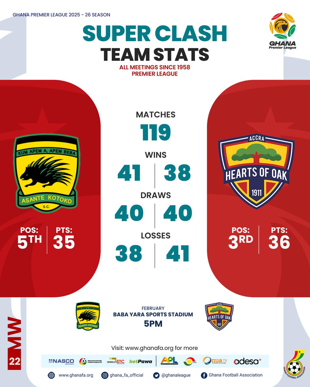 Ghana’s biggest football rivalry takes center stage once again as Asante Kotoko SC host sworn rivals Accra Hearts of Oak at the iconic Baba Yara Sports Stadium in a Super Clash brimming with tension, history and high stakes.