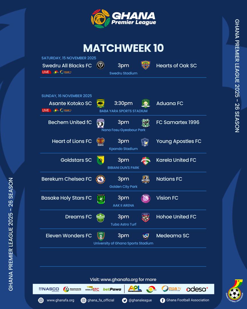 15:30 Swedru All Blacks vs Hearts of Oak - Swedru Sports Stadium, Agona Swedru (TV3, Onua TV, Adesa platforms)