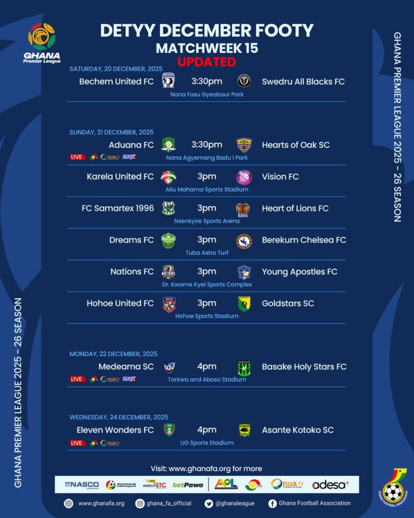 15:30 Aduana FC vs Hearts of Oak- Nana Agyemang Badu I Park, Dormaa Ahenkro (TV3, Onua TV, Adesa platforms)