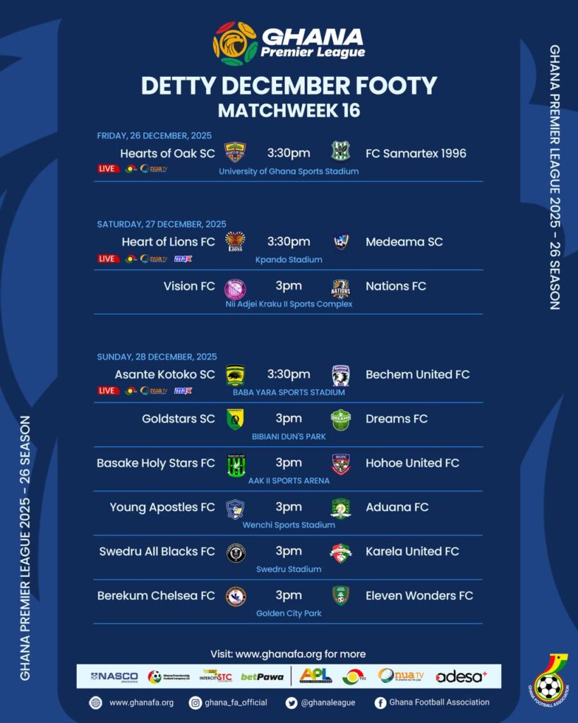 15:30 Hearts of Oak vs FC Samartex 1996- University of Ghana (TV3, Onua TV, Adesa platforms)