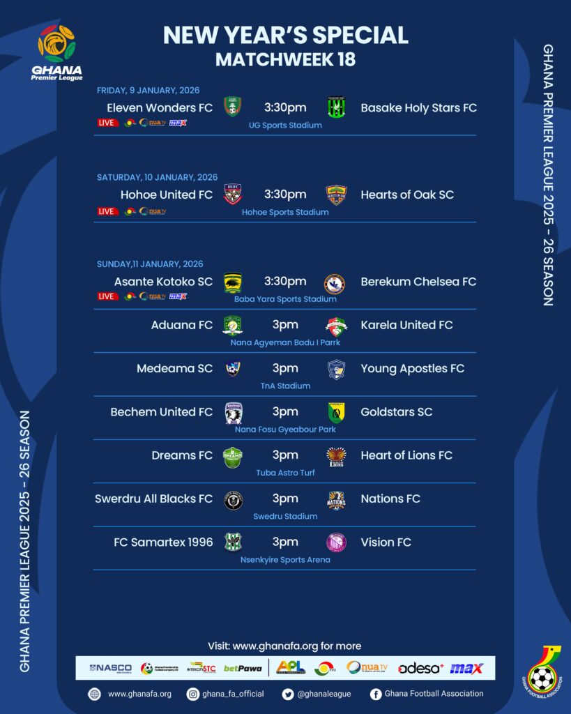 15:30 Hohoe United  vs Hearts of Oak - Hohoe Stadium, Hohoe (TV3, Onua TV, Adesa platforms)