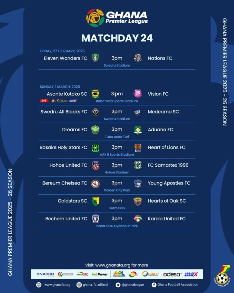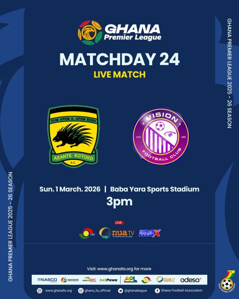 15:30 Asante Kotoko vs Vision FC- Baba Yara Stadium, Kumasi (TV3, Onua TV, Max TV, Adesa platforms)