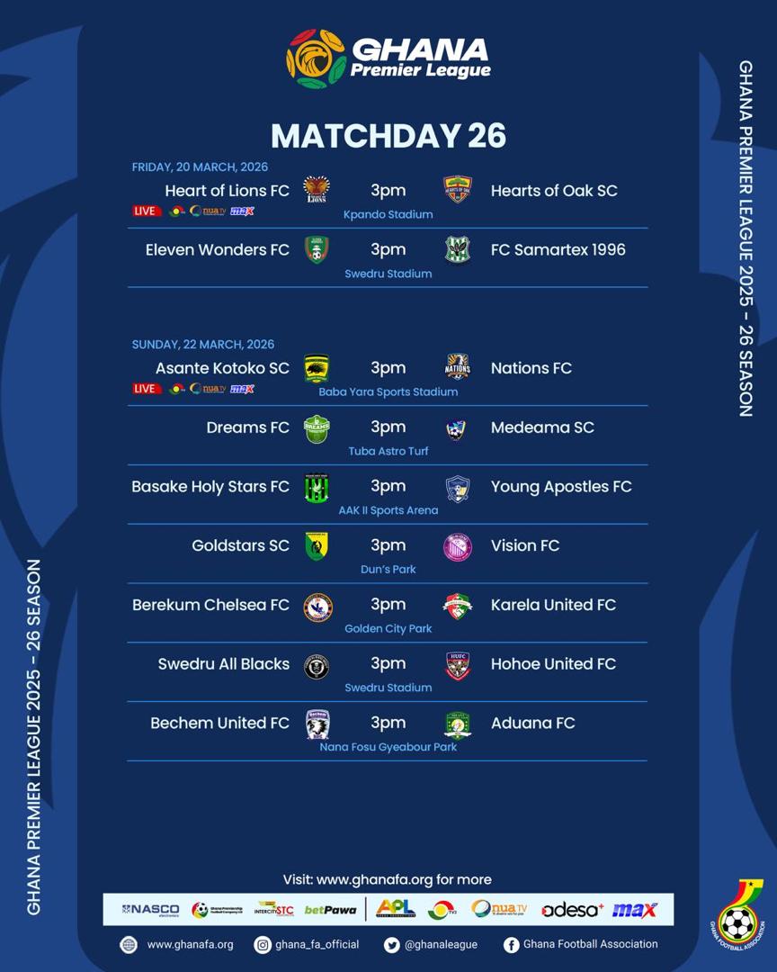 15:00 Asante Kotoko vs Nations FC - Baba Yara Stadium, Kumasi (TV3, Onua TV, Max TV, Adesa platforms)