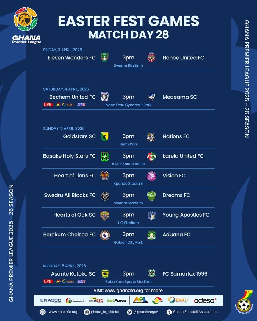 15:00 Bechem United FC vs Medeama SC- Nana Gyeabour Park, Bechem (TV3, Onua TV, Adesa platforms, Max TV)