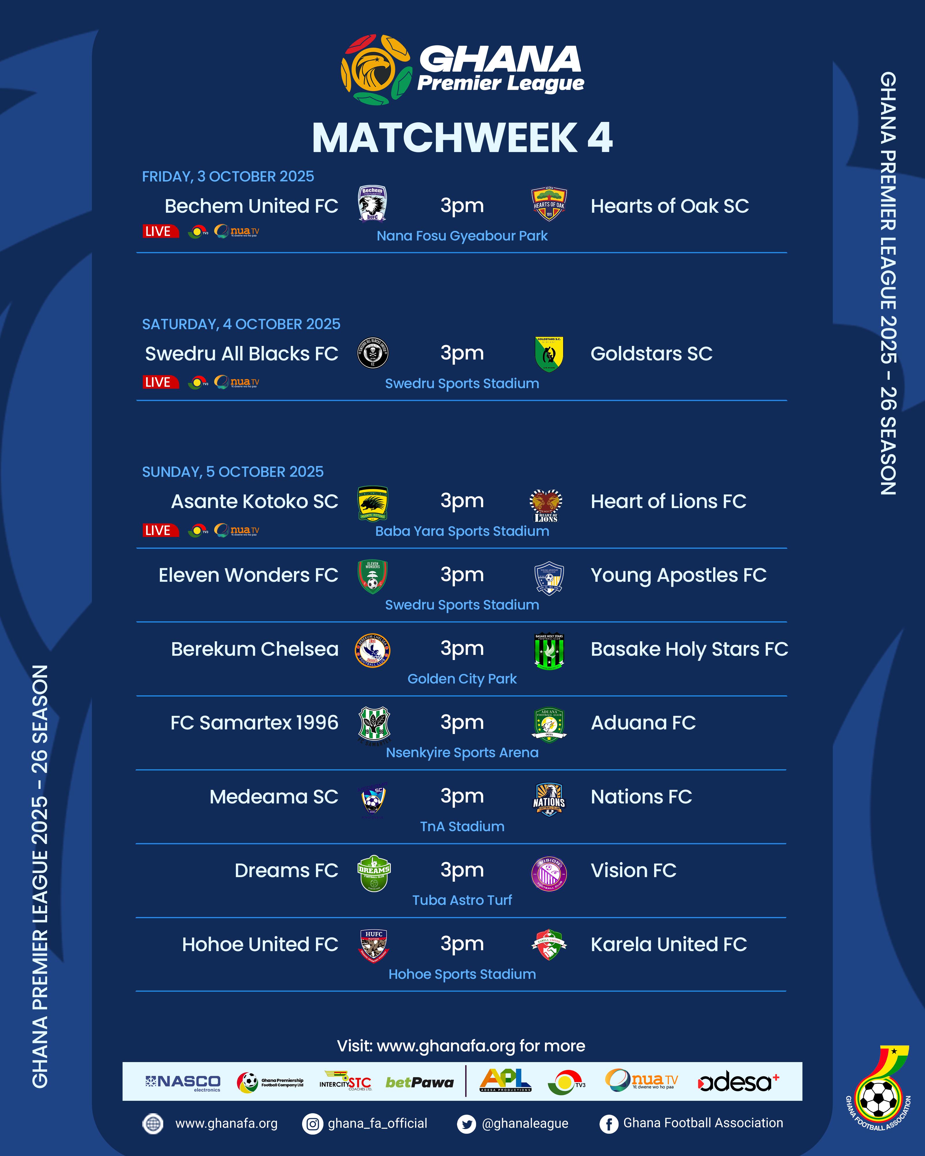 15: 00 Bechem United FC vs Hearts of Oak (TV3, Onua TV, Adesa platforms)