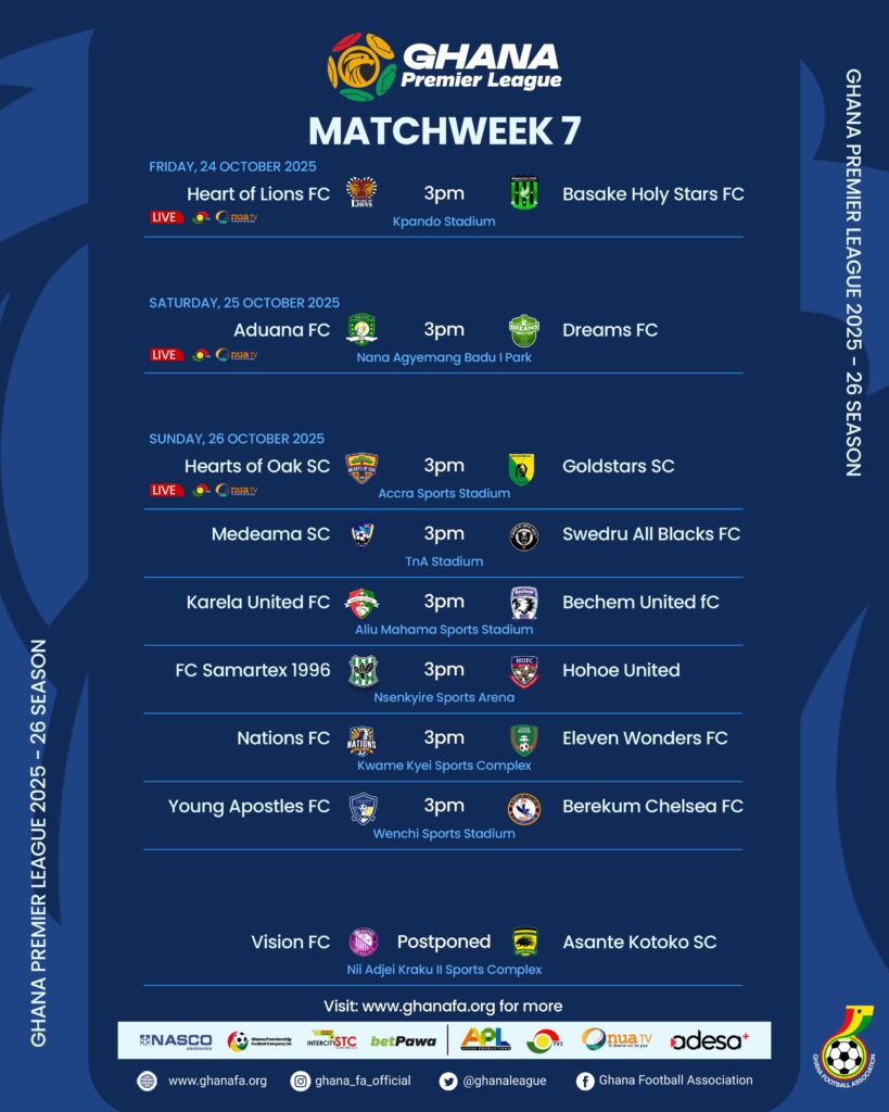 The Football Association has released the broadcast selections for Matchday 7 of the Premier League, confirming that three matches will be shown live across multiple platforms from Friday, October 24, to Sunday, October 26.