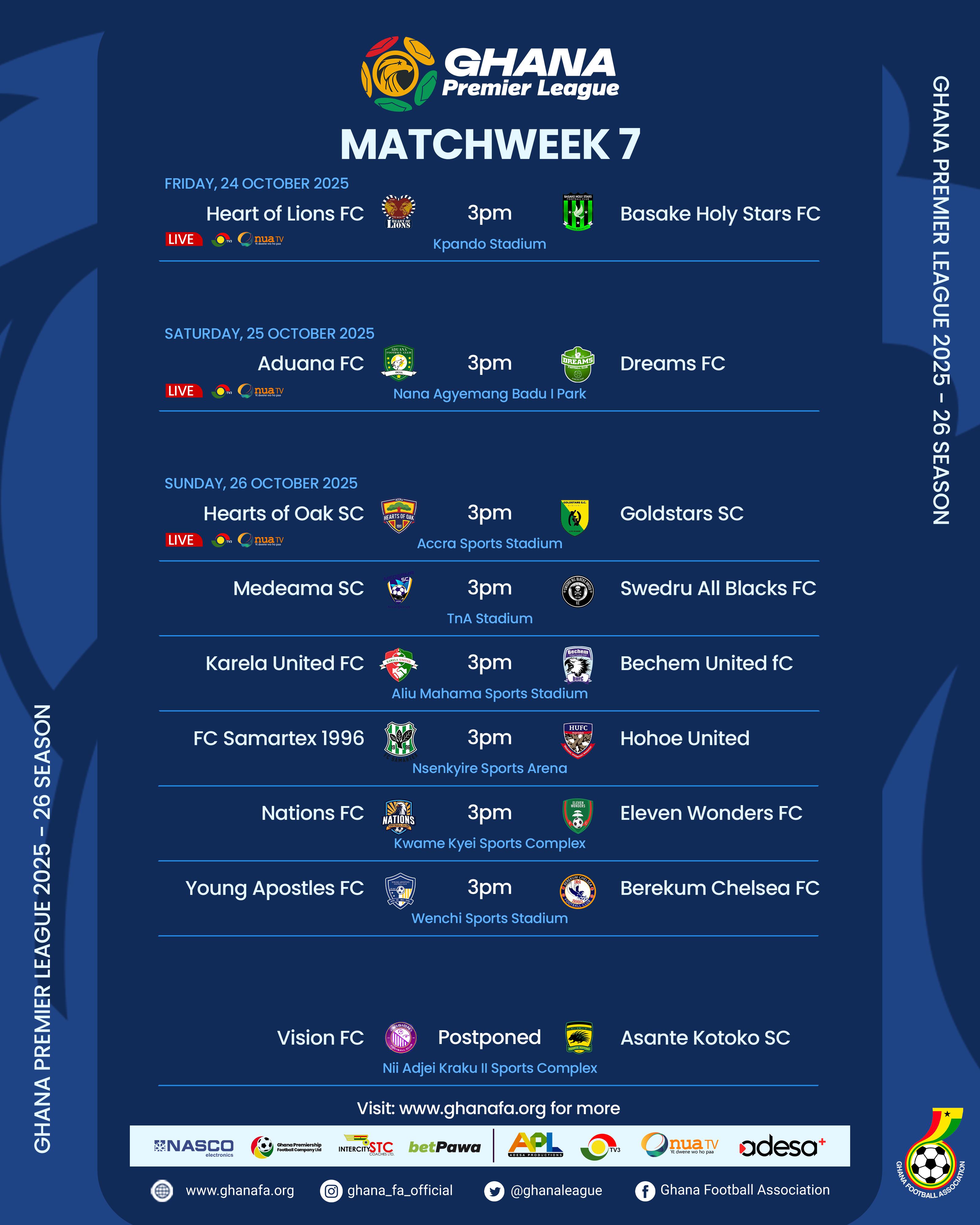 15:00 Hearts of Oak vs Gold Stars FC (TV3, Onua TV, Adesa platforms)