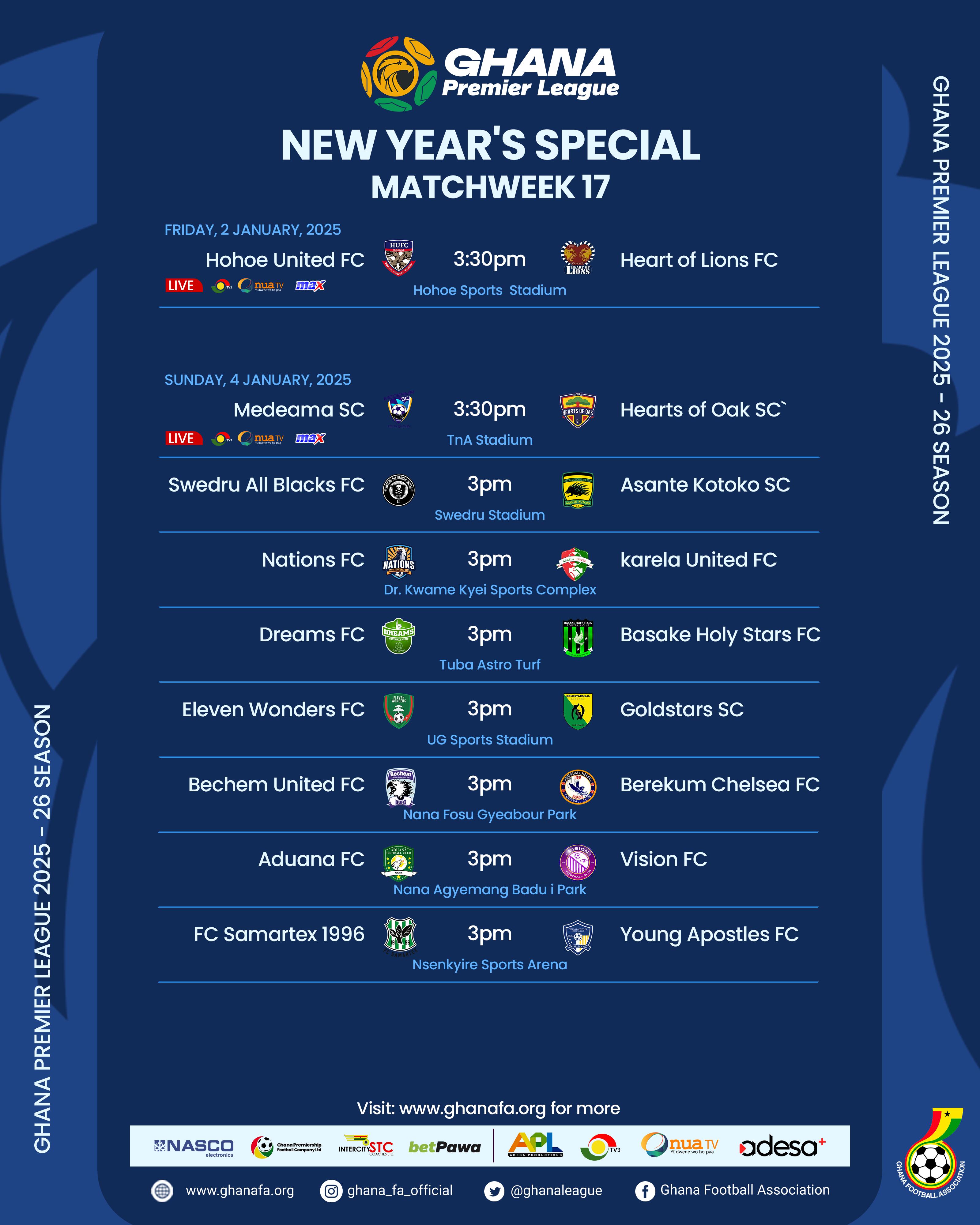 15:30 Hohoe United FC vs Heart of Lions- Hohoe Stadium, Hohoe (TV3, Onua TV, Adesa platforms)