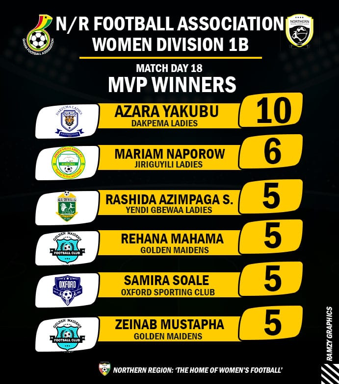 The season’s statistics reflect the high level of competition and the emergence of exciting attacking talents in the Northern Regional Women’s Division 1B League, as players continue to showcase their quality and contribute to the growth of women’s football in the region.