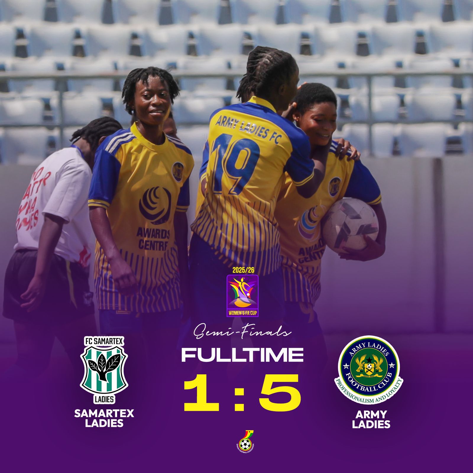 The Women’s FA Cup semi-final at the Cape Coast Sports Stadium delivered an exciting encounter as Army Ladies produced a dominant performance to defeat Samartex Ladies 5–1 and secure a place in the final.