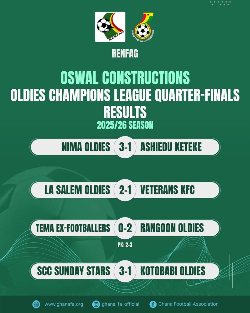 Elsewhere, La Salem Oldies edged Veterans KFC 2–1 in a closely contested encounter, and Rangoon Oldies rounded off the quarter-finals with a solid 2–0 win over Tema Ex-Footballers.