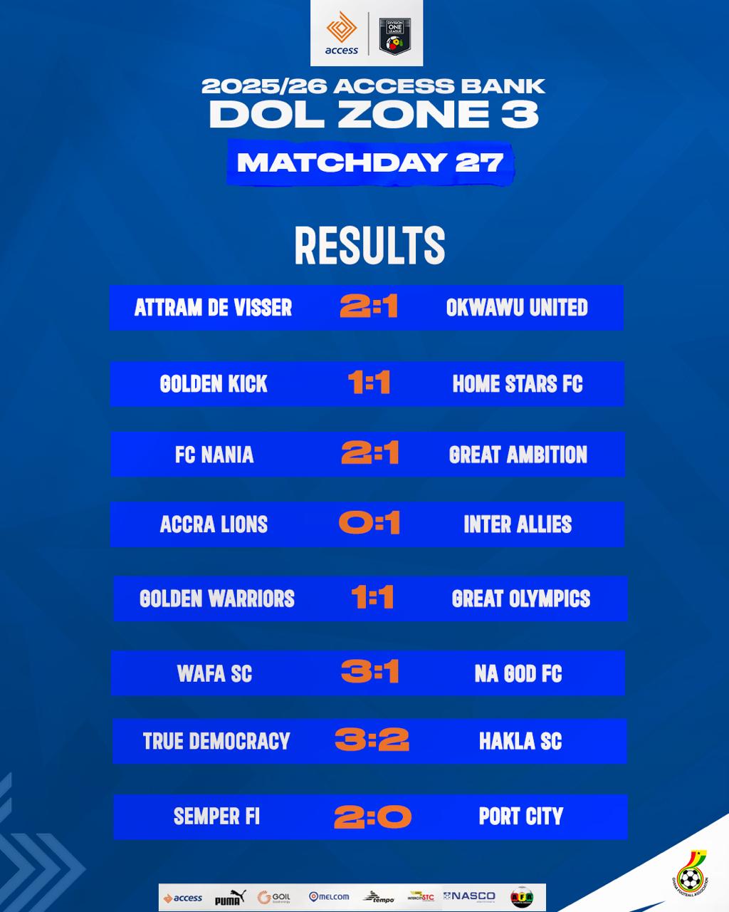 Mubarik Iddrisu put the hosts ahead in the 16th minute before Precious Yaw Gyimah added a second in the 37th minute. Substitute Morgan Abayatey pulled one back for Okwawu United deep into stoppage time, but it was not enough to prevent Attram De Visser from claiming all three points. Attram De Visser remain third on the table with 48 points after 27 games.