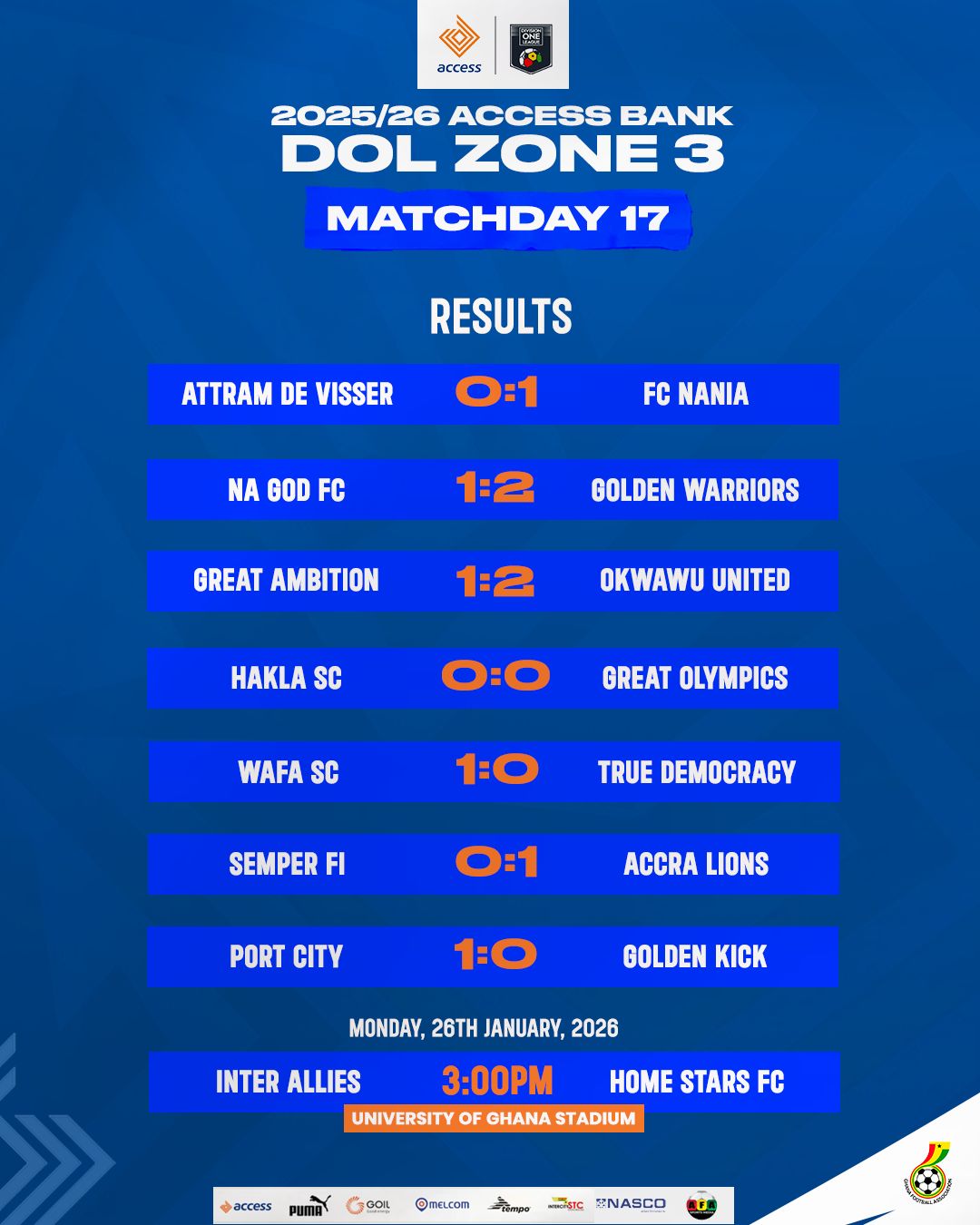 Meanwhile, title hopefuls Semper Fi FC’s poor run of form continued as they failed to secure a league victory for the sixth straight game (D4, L2). Semper FI suffered a narrow 1-0 home defeat to Accra Lions at the McDan Sports Complex in Teshie. Accra Lions captain Lawrence Norkplim struck in the 12th minute to end his side’s seven-game winless streak. Despite their struggles, Semper Fi FC remain second on the table with 30 points.