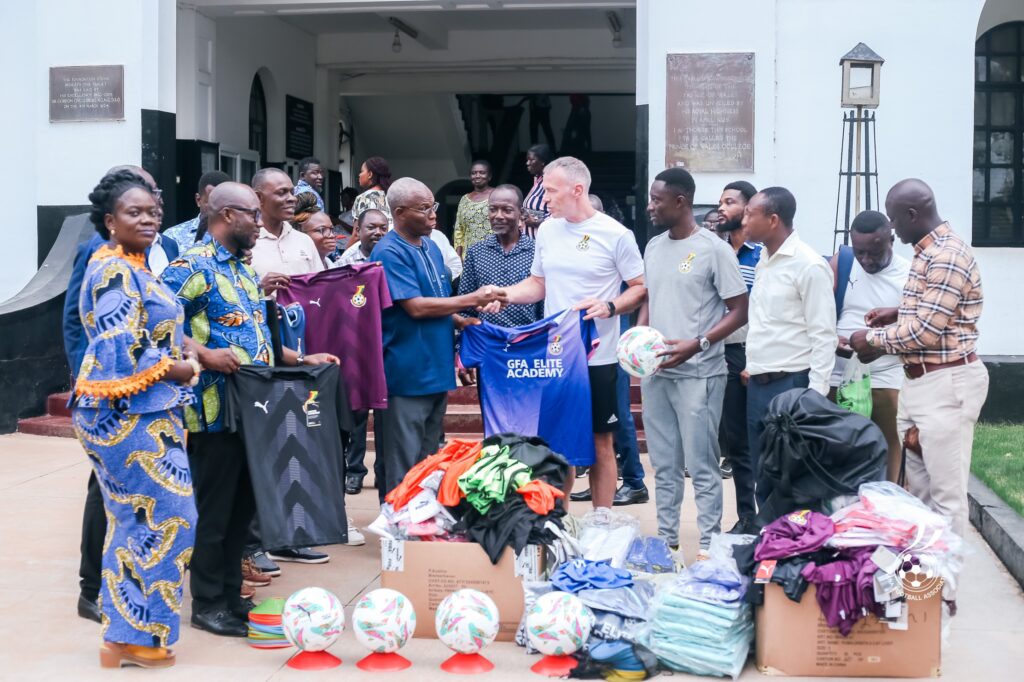A delegation made up of Joseph Tetteh Zutah, Stuart McLaren; Michael Adu-Asare and Esme Mends visited Achimota School on Monday, December 8, to deliver essential training equipment. The logistics package included 30 footballs, three sets of training jerseys, bibs, markers, cones, and two sets of official match-day kits—resources designed to support high-level technical training from the outset.