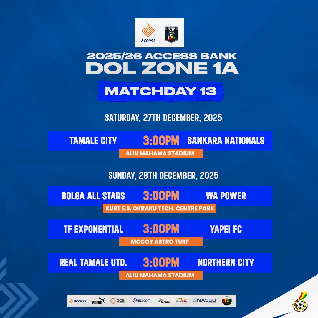 Tamale City and Real Tamale United will continue their two-horse race for the title in Zone One A when they face Sankara Nationals and Northern City on Matchday 13 of the Access Bank Division One League. Tamale City are 6 points clear at the top of the table in Zone One A, and a win over Sankara Nationals would further enhance their title charge heading into the end of the first round of the season. The former Premier League side leads the table with 28 points – 6 points ahead of closest contender Real Tamale United and 9 points ahead of Sankara Nationals, who are in third place. Tamale City have been in a rich vein of form, following three wins and two draws in their last five matches, and head into the match as favourites. The Citizens are unbeaten in the League, having conceded only 5 goals and scored 17 goals in the process.