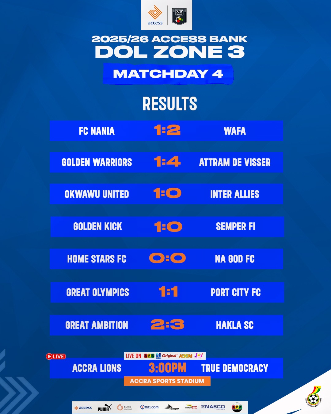 Meanwhile, at the McDan Sports Complex, Accra Great Olympics were held to a 1-1 draw by Port City FC in a tense and closely contested fixture. After a goalless first half, Osafo Antwi put the hosts ahead from the penalty spot in the 59th minute. Just when it seemed Olympics were on course for their first league victory since April 2025, Port City's Eric Tibu converted a late penalty to level the score, ensuring the visitors left with a share of the spoils.