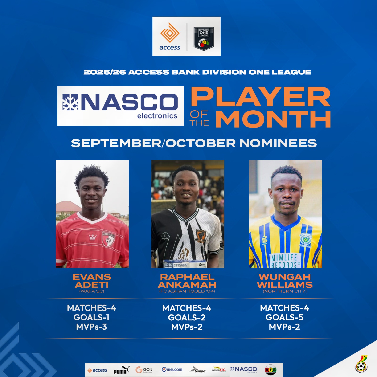 Three players have been nominated for the NASCO September/October Access Bank Division One League Player of the